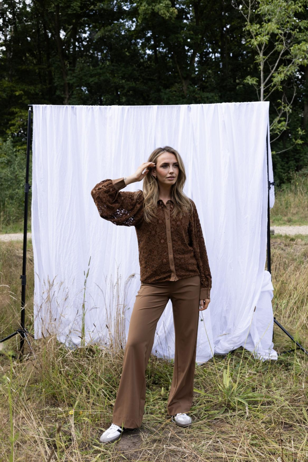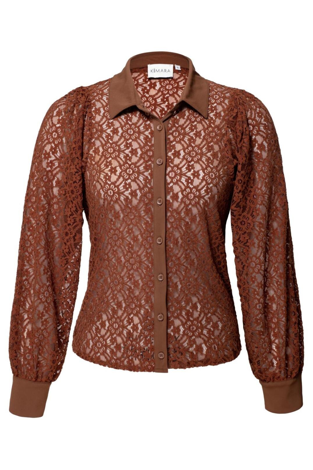 Deze Kimara damesblouse in de kleur 1103 CIDER WOOD, gemaakt van 60% polyester, 30% polyamide en 10% elastan, biedt een combinatie van comfort en stijl. Met een regular fit pasvorm en een klassieke puntkraag straalt deze blouse elegantie uit. Het overlay van bloemenkant in een warme bruine tint zorgt voor een subtiele glans dankzij het delicate glitterpatroon. De lange mouwen zijn afgewerkt met knoopmanchetten, waardoor je een verfijnde look creëert die perfect is voor zowel informele als iets formelere gelegenheden. Deze blouse past uitstekend bij een casual outfit en staat prachtig met een nette broek of een jeans. Ideaal voor de winterse maanden, voegt hij een chic accent toe aan je garderobe zonder ingestikt te zijn. De doorschijnende textuur maakt het ook een uitstekende keuze voor laagjes en zorgt ervoor dat je stijlvol blijft bij onverwachte ontmoetingen of een geplande avond uit. Met zijn eenvoudige knoopsluiting is dit stuk even praktisch als modieus, en hierdoor een veelzijdige aanvulling op je dagelijkse kleding.