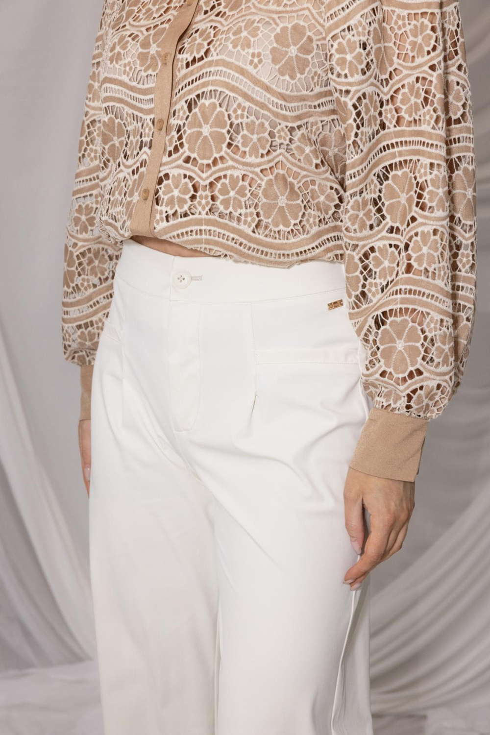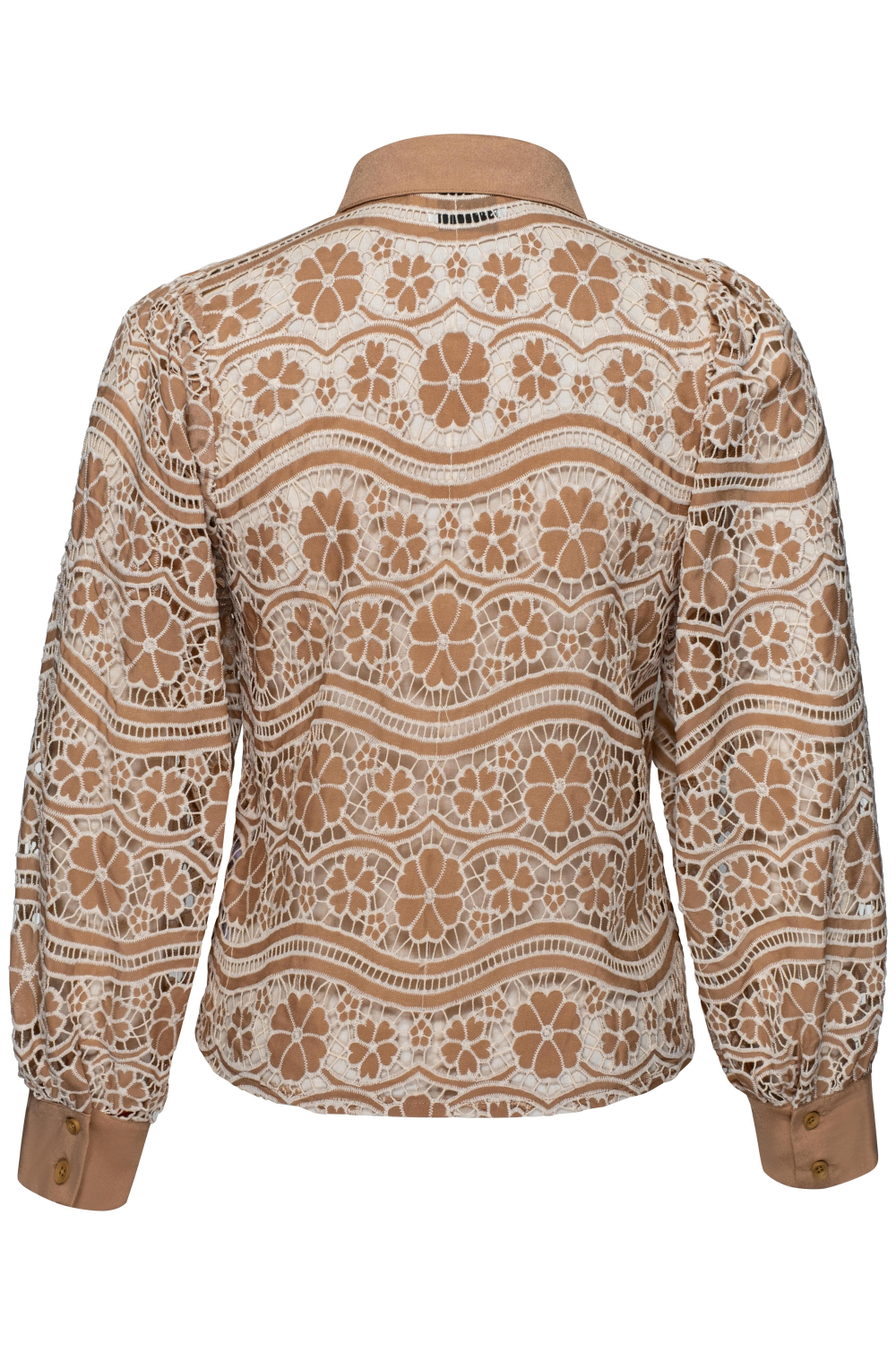 Deze elegante ajour blouse van Kimara is een stijlvolle toevoeging aan je casual lente garderobe. Het blouseontwerp benadrukt een fijn geknoopte structuur met een prachtig bloemmotief in warme beige tinten, waardoor het een verfijnde en vrouwelijke uitstraling heeft. De puntkraag en de reguliere pasvorm zorgen voor een klassieke look die comfortabel aanvoelt dankzij het gebruik van 100% polyester. Deze blouse is perfect voor een ontspannen lunch met vrienden of een dag in de stad. Je kunt hem eenvoudig combineren met een jeans of een lichte pantalon voor een verfijnde alledaagse look. Met zijn lange mouwen en knoopsluiting biedt deze blouse zowel stijl als flexibiliteit, waardoor je bij elke gelegenheid goed voor de dag komt. Het is een veelzijdig kledingstuk dat je garderobe zeker verrijkt.