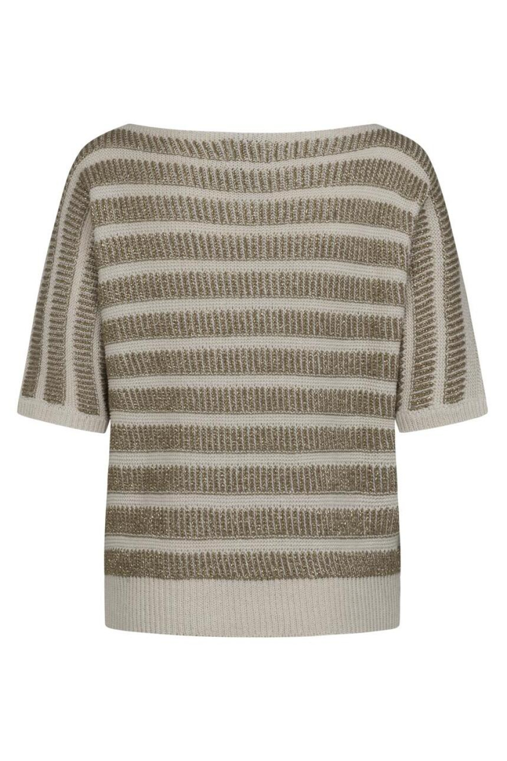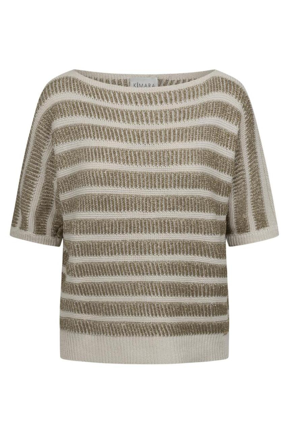 Deze Kimara trui is een elegante toevoeging aan je lente garderobe. Met een regular fit en een stijlvolle boothals biedt het een comfortabele pasvorm. De off-white en gouden glitterstrepen geven de trui een verfijnde uitstraling, waardoor je een subtiel vleugje glamour aan je dagelijkse look toevoegt. De korte mouwen maken het perfect voor milde lentedagen, en de normale lengte is ideaal om zowel in als over je broek of rok te dragen. De Kimara trui is veelzijdig in zijn toepassingen. Hij is uitstekend geschikt voor informele bijeenkomsten of een dagje uit in de stad, waarbij je moeiteloos stijl en comfort combineert. De glinsterende accenten zorgen ervoor dat je altijd een verfijnde indruk maakt. Combineer hem met een nette pantalon voor een elegante uitstraling of draag hem met jeans voor een casual look. Deze trui is een uitstekende keuze voor elke gelegenheid waarin je jezelf wilt onderscheiden.