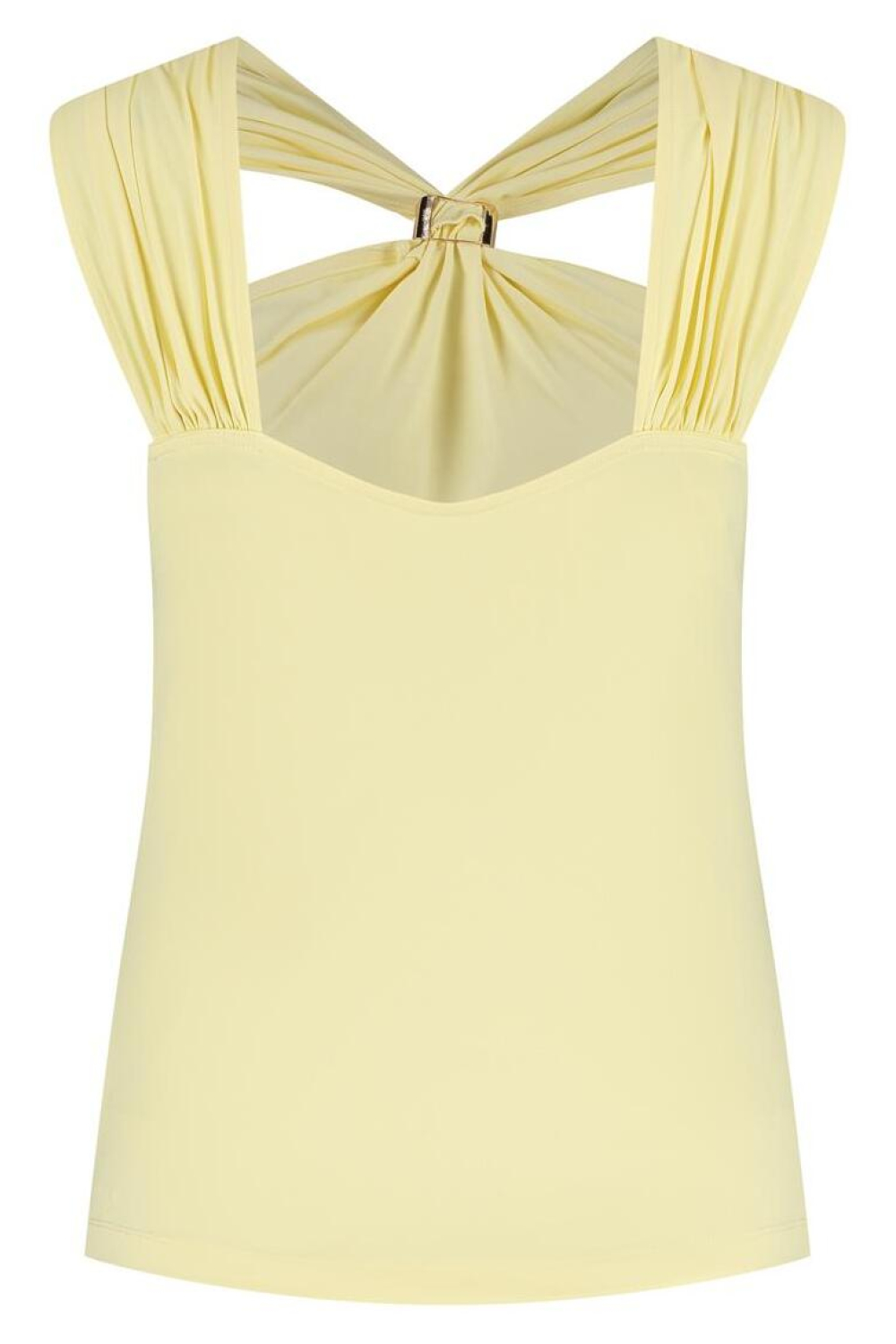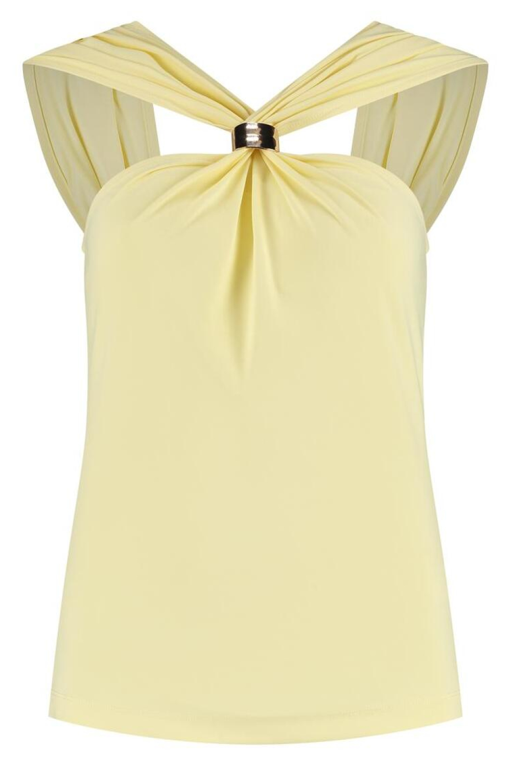 Deze stijlvolle Lady Day top biedt een perfecte balans tussen comfort en elegantie, en is een waardevolle aanvulling op je zomergarderobe. Met een zachte mix van 80% polyamide en 20% elastan zorgt de top voor een flexibele en ademende pasvorm. De subtiele crèmekleur in combinatie met de verfijnde V-hals creëert een tijdloze uitstraling die bij verschillende stijlen past. De opvallende geplooide schouderbanden komen samen in een decoratieve metalen ring, wat een verfijnd detail toevoegt aan dit eenvoudige maar chique ontwerp. Ideaal voor casual gelegenheden, de Lady Day top is veelzijdig genoeg om te dragen tijdens een ontspannen brunch met vrienden of een dagje uit in het park. Combineer hem met een lichte denim voor een moeiteloze zomerse look, of draag hem met een elegante rok voor een wat formelere setting. De mouwloze constructie houdt je koel tijdens warme dagen, terwijl de reguliere pasvorm ervoor zorgt dat je de hele dag comfortabel blijft. Deze top biedt zowel stijl als praktische bruikbaarheid, zonder afbreuk te doen aan jouw individuele flair.