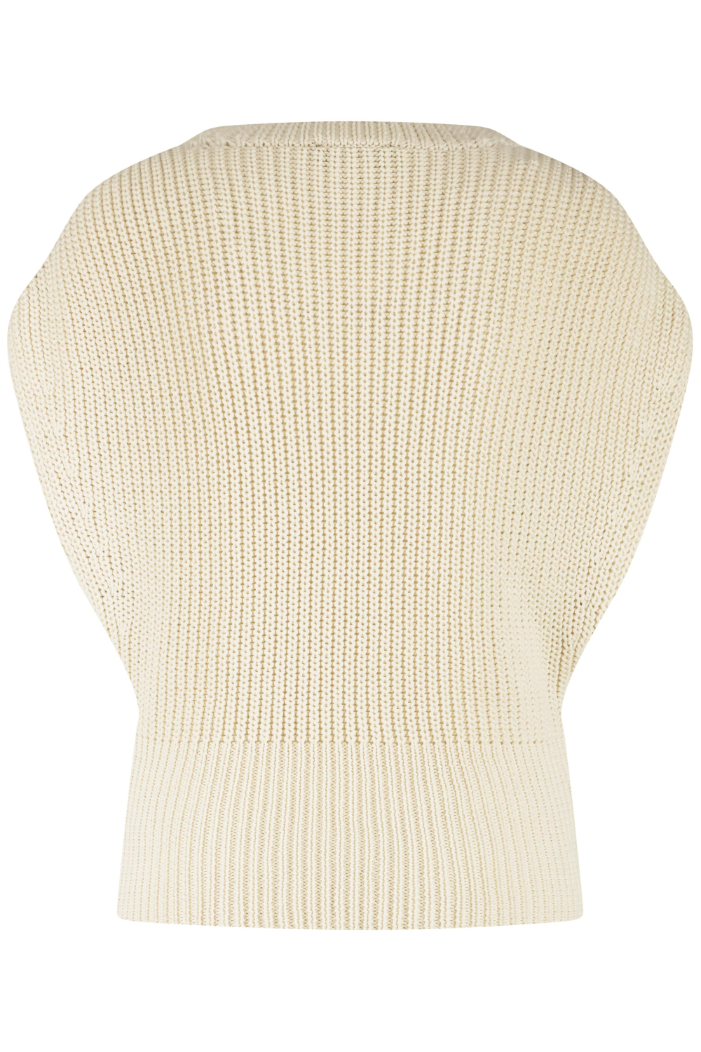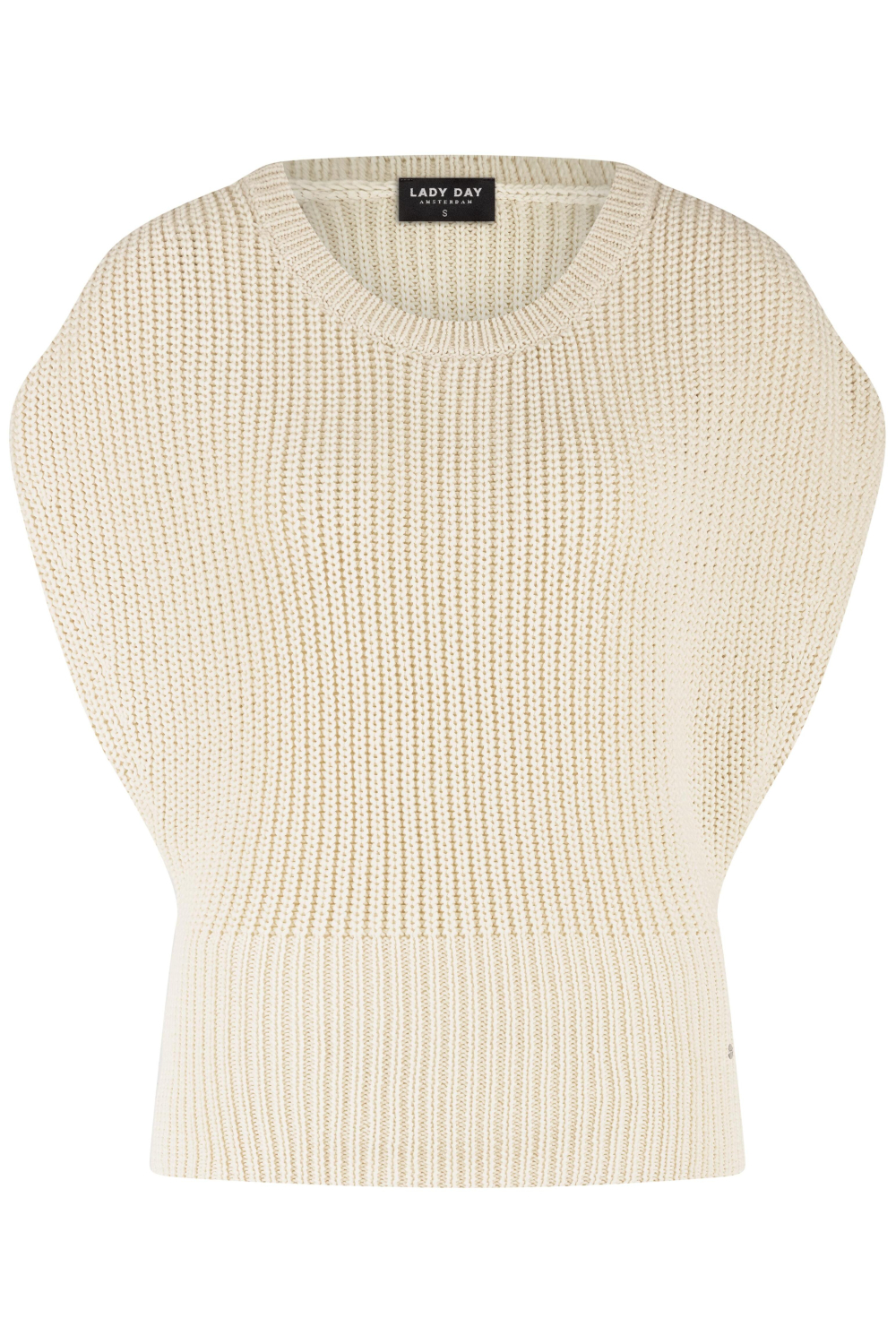 Deze stijlvolle Lady Day trui in de kleur cream is een perfecte aanvulling op je herfstgarderobe. Gemaakt van een comfortabele blend van 60% katoen en 40% polyamide, biedt deze oversized trui een zacht en aangenaam draagcomfort. De ronde halslijn en het mouwloze ontwerp maken het een veelzijdig stuk dat je gemakkelijk kunt combineren met andere kledingstukken. Het gebreide patroon geeft de trui een moderne, maar toch tijdloze uitstraling, ideaal voor verschillende gelegenheden.