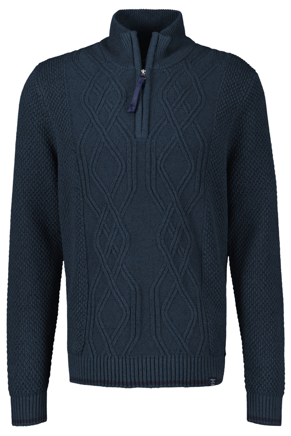 Deze navy gemêleerde trui van Lerros is een tijdloze toevoeging aan je wintergarderobe. Met een comfortabele regular fit en een praktische ritssluiting is dit knitwear item ideaal voor koude dagen. De hoge kraag biedt extra warmte, terwijl het zorgvuldig ontworpen kabelpatroon aan de voorzijde de trui een chique uitstraling geeft. Gemaakt van een zachte mix van 67% katoen en 33% acryl, voel je je de hele dag door comfortabel. Of je nu binnen blijft bij de open haard of een winterse wandeling maakt, deze Lerros trui past zich moeiteloos aan elke situatie aan. De lange mouwen en de normale lengte maken het een veelzijdige keuze die goed samengaat met zowel een casual jeans als een wat nettere broek. Dankzij de klassiek navy kleur is hij eenvoudig te combineren, waardoor je zonder moeite een stijlvolle look creëert, ongeacht de gelegenheid.