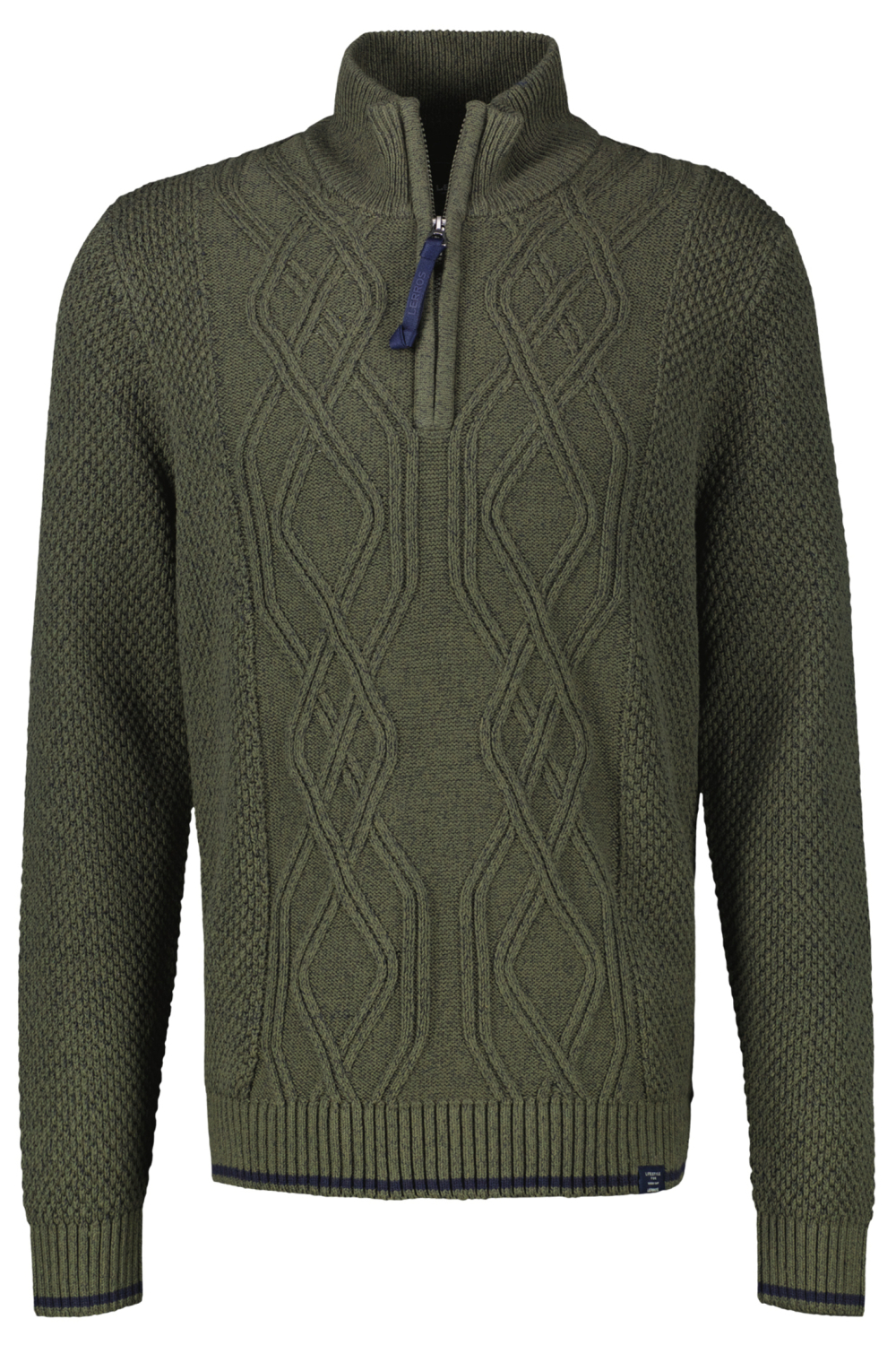Deze Lerros trui in de kleur 661 NORDIC OLIVE is een stijlvolle en warme toevoeging aan je wintergarderobe. Het regular fit design biedt comfort zonder in te boeten op stijl. Het gemêleerde patroon voegt een subtiele textuur toe, terwijl de high neck met rits zorgt voor extra warmte en een moderne uitstraling. De combinatie van 67% katoen en 33% acryl maakt deze trui zowel zacht als stevig. Met zijn lange mouwen en normale lengte is de Lerros trui perfect voor zowel casual als iets formelere gelegenheden. Draag hem over een overhemd voor een gelaagde look, ideaal voor een dag op kantoor, of combineer hem met een spijkerbroek voor een ontspannen weekenduitstapje. De kenmerkende gebreide details aan de voorkant geven de trui een unieke uitstraling, waardoor het een veelzijdige keuze is voor verschillende stijlen en situaties.