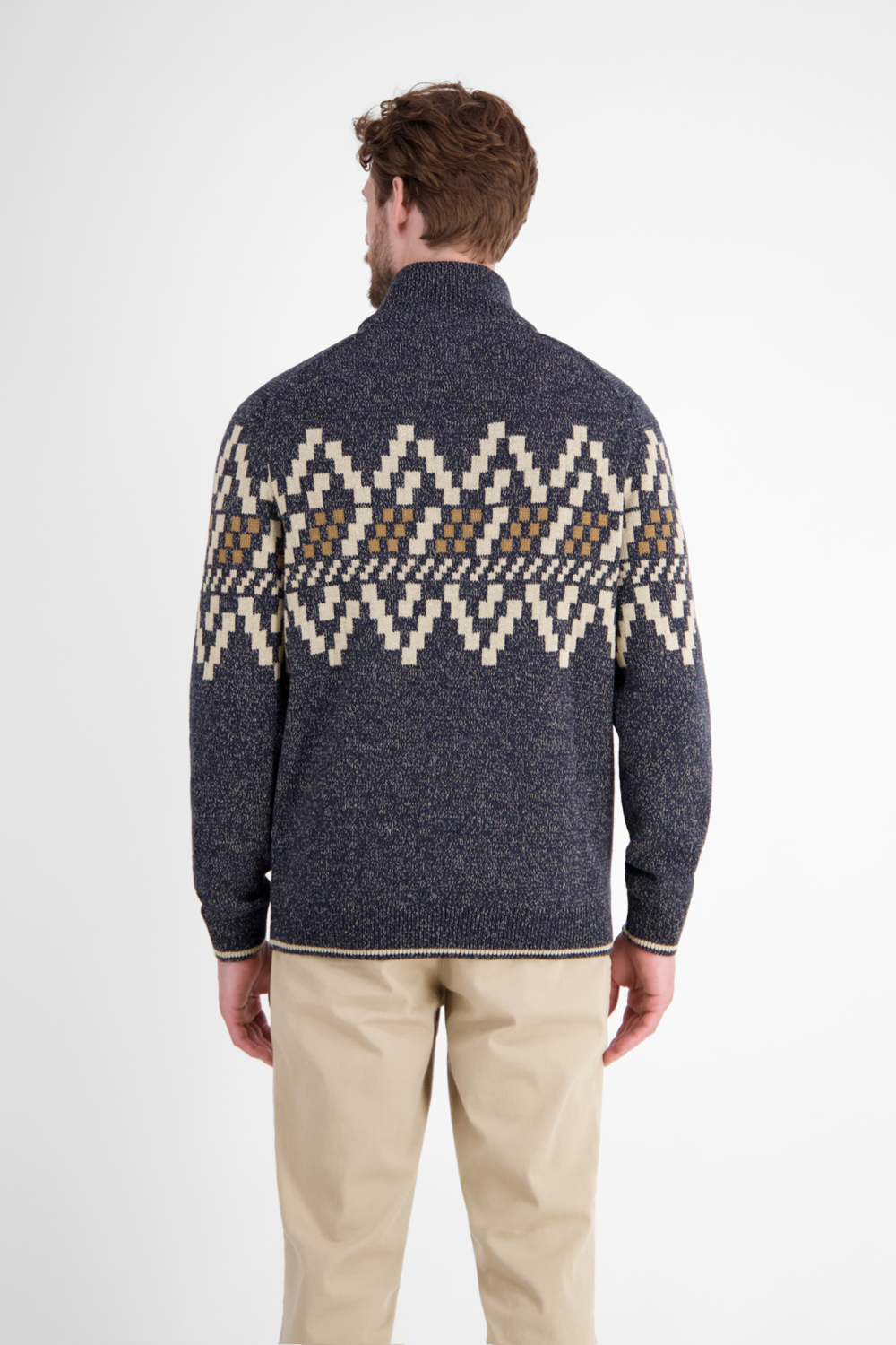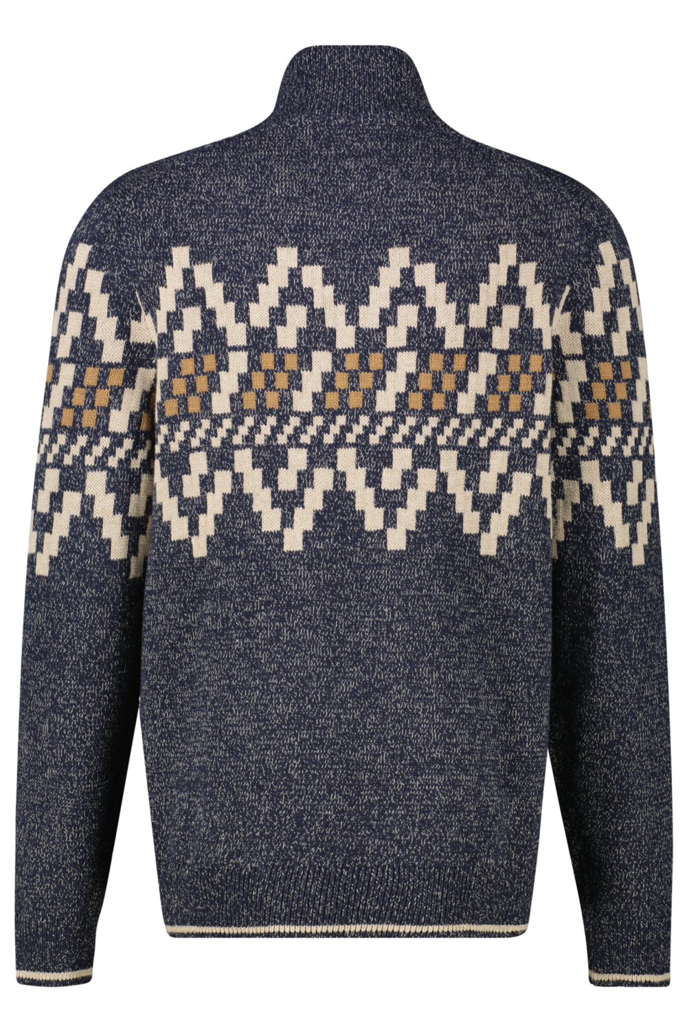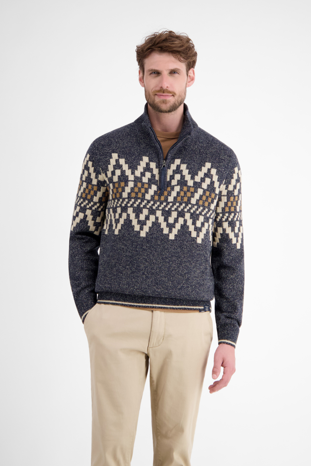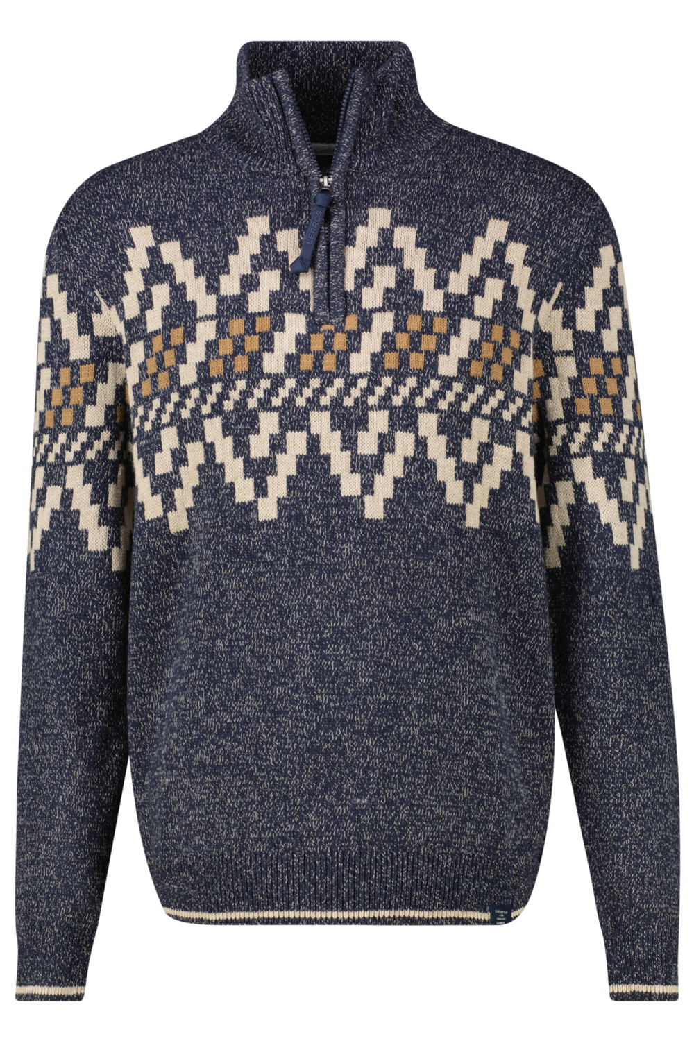 Deze navy gebreide trui van Lerros is een stijlvolle toevoeging aan je wintergarderobe. De trui heeft een gemêleerd patroon met een opvallend grafisch ontwerp in warme beige en bruine tinten, wat het tot een unieke keuze maakt voor elke gelegenheid. De regular fit pasvorm en het gebruik van 67% katoen en 33% acryl zorgen voor comfort en warmte op koude dagen. De high neck met ritssluiting voegt niet alleen karakter toe, maar biedt je ook de mogelijkheid om de trui aan te passen aan jouw comfortvoorkeur.