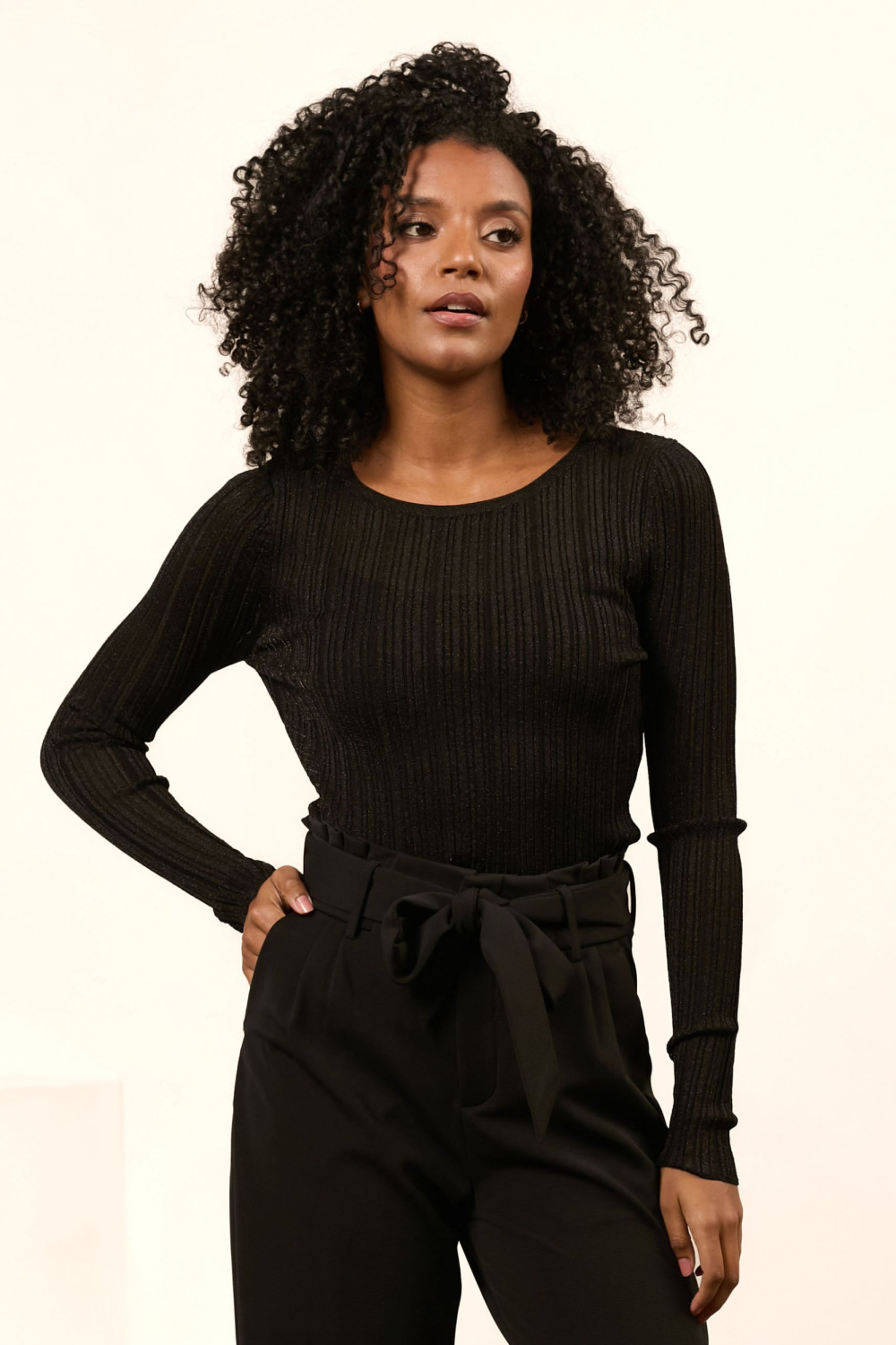 Dit zwarte dames T-shirt van Lofty Manner is een elegante toevoeging aan je wintergarderobe. De slim fit pasvorm sluit mooi aan op je lijf, terwijl de lange mouwen en normale lengte zorgen voor een fijne drape. Met een subtiele ronde hals en verfijnde glitters, biedt dit shirt een casual stijl met een vleugje glamour. De ribstof voegt een extra dimensie toe aan de textuur, waardoor het T-shirt zowel uniek als comfortabel aanvoelt. Je kunt dit veelzijdige T-shirt met gemak combineren in verschillende settings. Of je nu een dagje op kantoor hebt of een avondje uit gaat, het past perfect. Draag het met een nette pantalon voor een professionele look of kies voor een casual outfit met je favoriete jeans. Dankzij de subtiele glitterdetails kun je met dit T-shirt zowel overdag als 's avonds stralen. Dit is een stijlvolle keuze die je moeiteloos laat wisselen tussen verschillende gelegenheden.