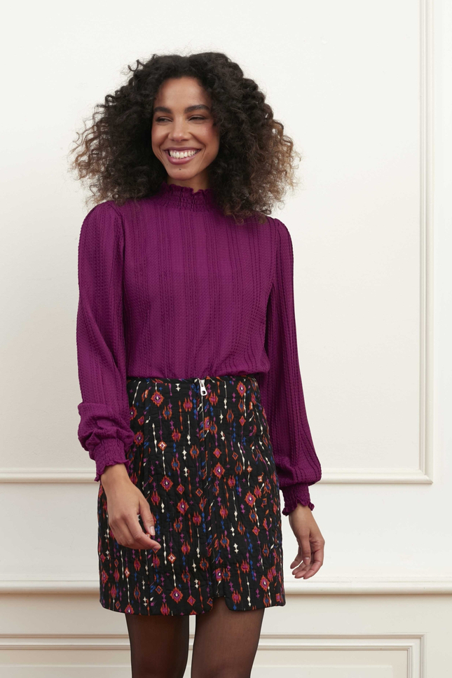 Dit Lofty Manner T-shirt in de rijke kleur 796 plum is een elegante keuze voor dames die van stijlvolle casual mode houden. De high neck geeft een verfijnde uitstraling, terwijl de lange mouwen je warm houden tijdens de koudere wintermaanden. De prachtige gestructureerde stof, gemaakt van 95% polyester en 5% elastan, zorgt voor een comfortabele draagervaring en biedt een speelse touch aan je outfit. De reguliere pasvorm maakt het een veelzijdig kledingstuk dat je moeiteloos kunt combineren met zowel jeans als een rok. Dit T-shirt van Lofty Manner leent zich perfect voor uiteenlopende gelegenheden. Of je nu naar een gezellige familiebrunch gaat of een dagje op kantoor doorbrengt, het straalt een subtiele elegantie uit die bij elke setting past. De normale lengte zorgt ervoor dat het shirt zowel los als ingestopt gedragen kan worden, waardoor je alle vrijheid hebt om jouw persoonlijke stijl tot uiting te brengen. Voeg een paar elegante laarzen of comfortabele sneakers toe, en je bent klaar voor elke dag met een vleugje modebewustzijn.