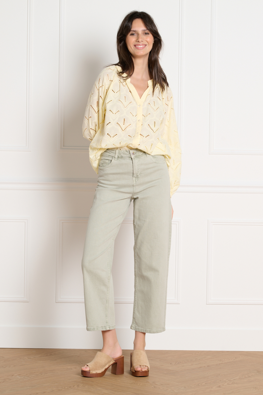 Deze LolaLiza blouse is een subtiele eyecatcher in je garderobe. Gemaakt van 100% katoen, biedt deze blouse een lichte en ademende ervaring, ideaal voor de lente. De zachte gele kleur wordt prachtig geaccentueerd door een verfijnd ajour patroon, dat een speels detail toevoegt zonder te overdrijven. De blouse heeft een regular fit en een elegante V-hals, waardoor hij comfortabel en flatterend is voor elke lichaamsvorm. De lange mouwen dragen bij aan een moeiteloze look die je met verschillende stijlen kunt combineren.