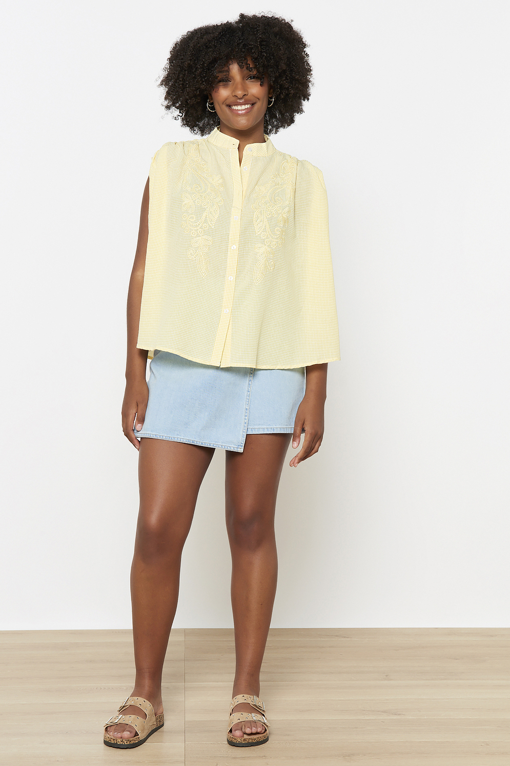 Deze casual blouse van LolaLiza in een lichte, zomerse gele tint is een veelzijdige aanwinst voor je garderobe. De stof is een comfortabele mix van 50% katoen en 50% polyester, wat zorgt voor een aangename draagervaring tijdens warme dagen. Het mouwloze ontwerp en de ronde hals maken deze blouse perfect voor zomerse uitjes. De subtiele structuur en het elegante borduurpatroon op de voorkant geven het geheel een verfijnde, maar toch ontspannen uitstraling. Met een oversized fit en knoopsluiting biedt deze blouse niet alleen stijl, maar ook functionaliteit. Je kunt het gemakkelijk combineren met een jeans of een luchtige rok voor een casual look. Voor een meer verzorgde outfit is het te dragen met een nette pantalon. Dit item is ideaal voor zowel een dagje uit met vrienden als een zomerse barbecue. De normale lengte maakt het eenvoudig te dragen, of je nu kiest voor een gepolijste of casual look.