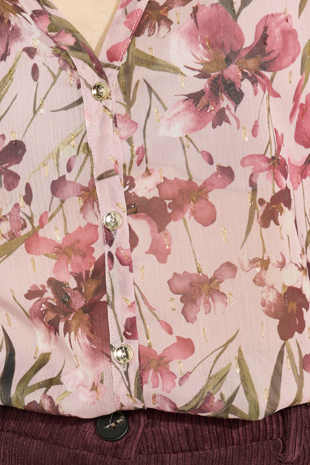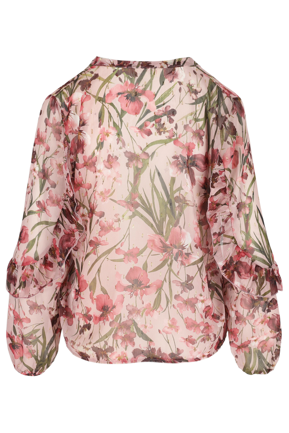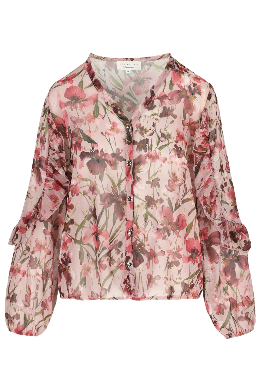 Deze verfijnde blouse van LolaLiza in de kleur 5733 Cosmetic Pink straalt elegantie uit met zijn delicate bloemenpatroon. Gemaakt van 98% polyester en 2% metaalgaren, biedt het een subtiele glans die de look extra charme geeft. De blouse heeft een regular pasvorm en komt samen met een diepe V-halslijn en lange mouwen, wat zorgt voor een stijlvolle uitstraling. De knoopsluiting voegt een klassiek tintje toe, perfect voor zowel casual als meer formele gelegenheden.