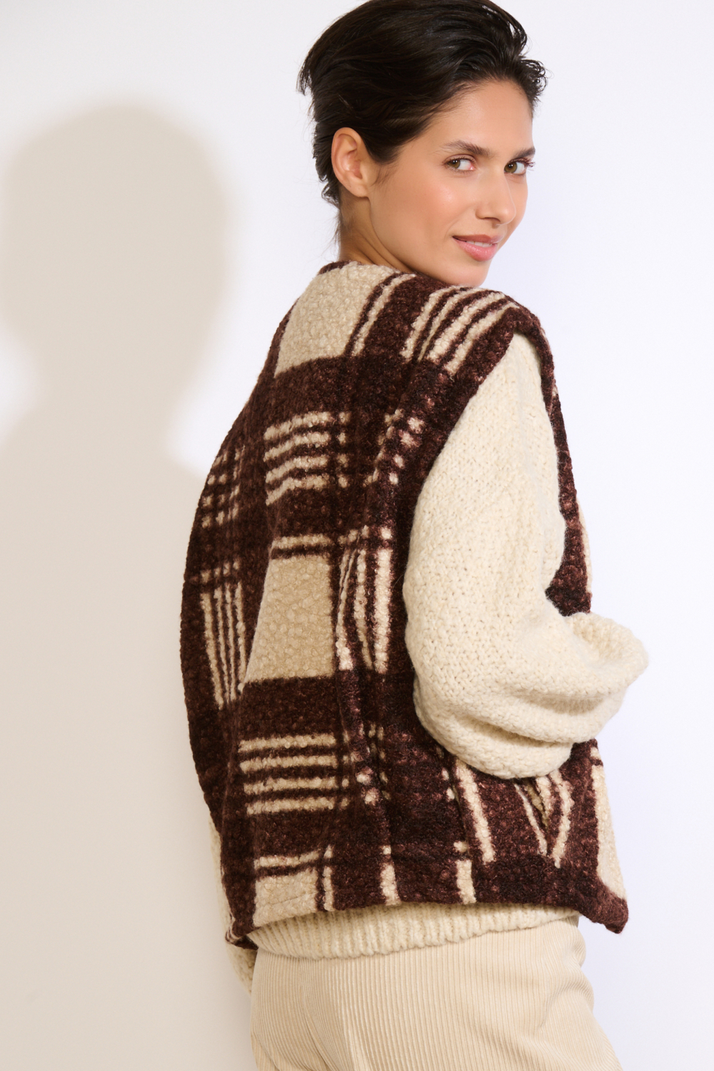 Dit casual dames gilet van LolaLiza is een veelzijdige aanvulling op je wintergarderobe. Het mouwloze ontwerp is gemaakt van 100% polyester en heeft een regular pasvorm die zorgt voor een comfortabele en ontspannen uitstraling. Met zijn ronde hals en geblokt patroon in warme tinten bruin en crème, biedt dit gilet een stijlvolle touch aan je outfit. Zonder zakken is het ontwerp eenvoudig en strak gehouden, perfect voor een minimalistische look.
