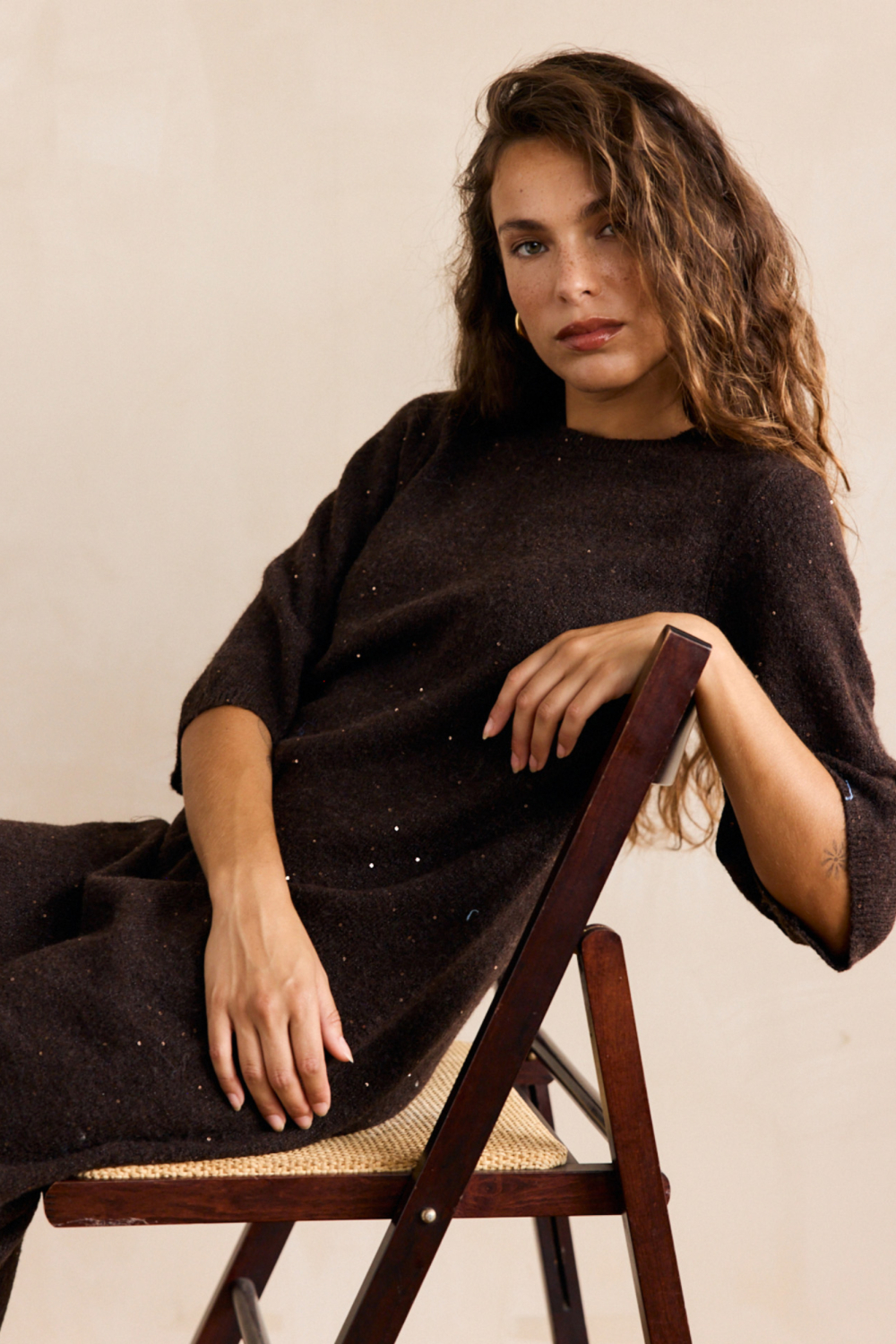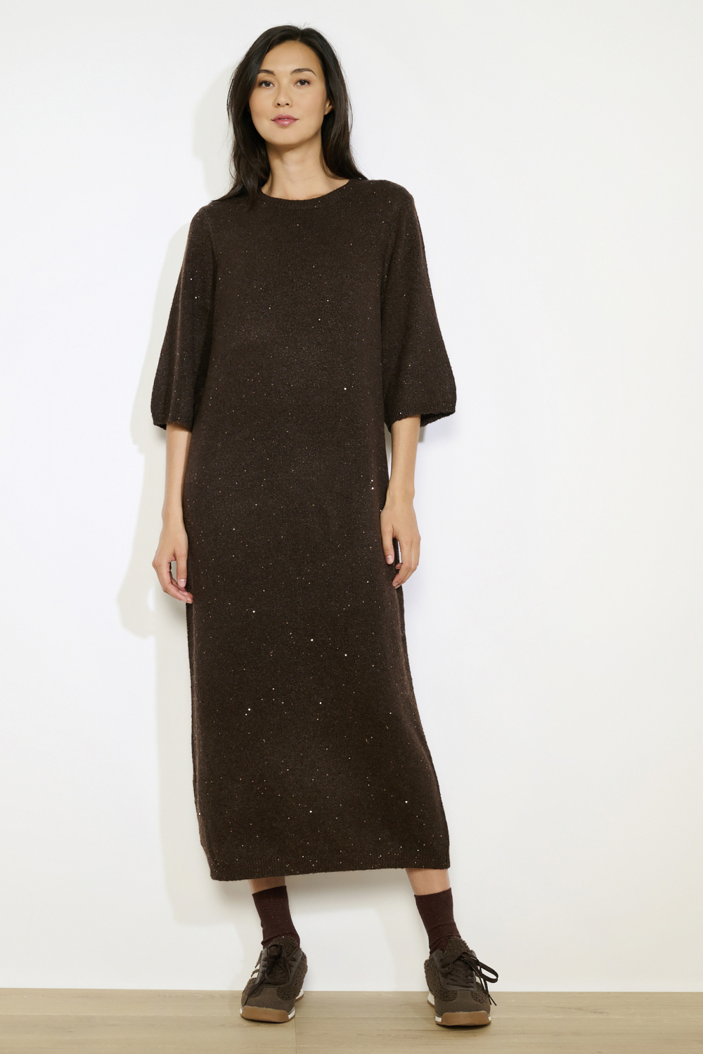 Deze jurk is perfect voor diverse gelegenheden, van een ontspannen dagje uit tot een casual avondje met vrienden. De donkere tinten en subtiele glitteraccenten maken het gemakkelijk te combineren met je favoriete paar sneakers of laarzen. De stof voelt zacht aan en beweegt soepel mee, zodat je er de hele dag goed uitziet en je prettig voelt. Voeg dit veelzijdige stuk toe aan je herfstcollectie voor een moeiteloze stijl die bij elke gelegenheid past.
