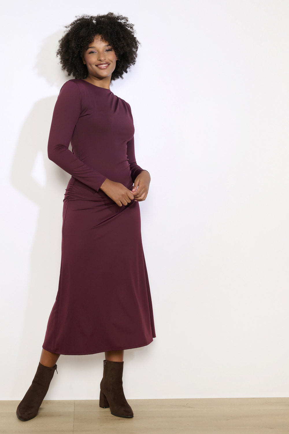 Met zijn rijke bordeauxrode kleur is deze jurk een uitstekende keuze voor zowel informele als meer geklede gelegenheden. De 7/8 lengte geeft een moderne twist aan het klassieke silhouet, en maakt het mogelijk om te combineren met zowel enkellaarsjes als hoge laarzen. Of je nu een wandeling maakt in het stadspark of geniet van een informeel diner, deze jurk biedt de juiste balans tussen comfort en stijl. Voeg hem toe aan je collectie voor een moeiteloos elegante look die geschikt is voor elke winterdag.