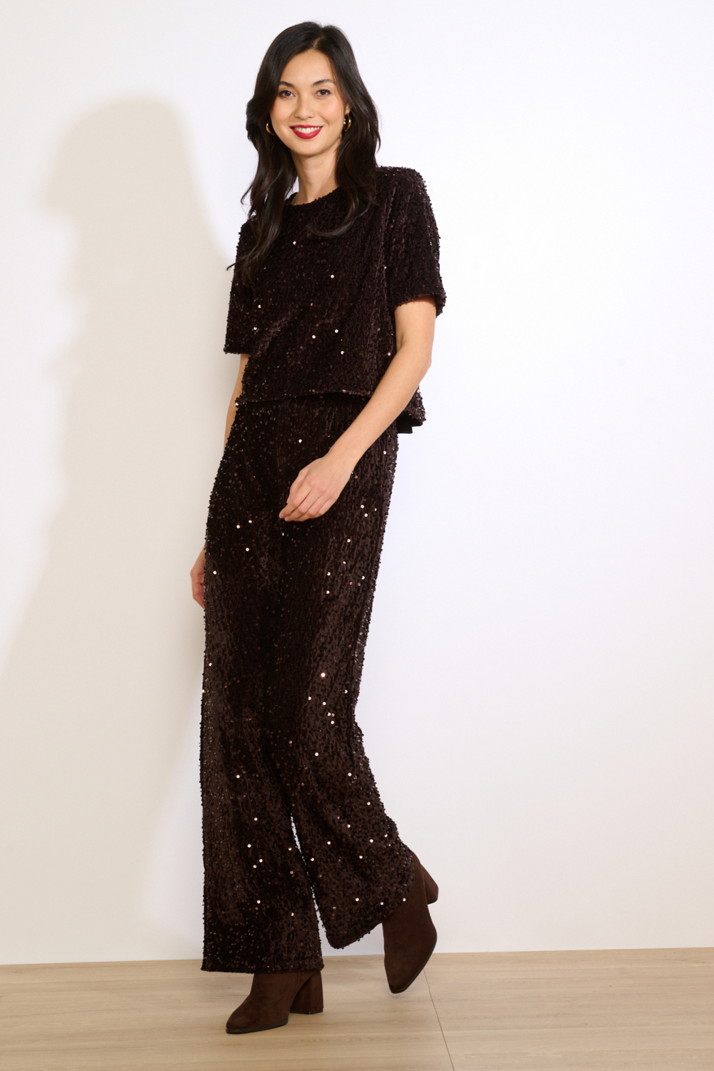 Dit elegante donkere T-shirt van LolaLiza is perfect voor dames die een vleugje glamour willen toevoegen aan hun wintergarderobe. Met een zachte polyestermix die een comfortabele pasvorm biedt, is dit T-shirt een stijlvolle keuze voor elke party. Het opvallende ontwerp met schitterende pailletten in de kleur 3720 Brown Dark Choc creëert een sprankelende uitstraling, terwijl de ronde hals en korte mouwen zorgen voor een klassieke afwerking. De strikkoord aan de achterkant geeft een subtiel detail dat je look verfijnt. Of je nu naar een feest gaat of een speciale gelegenheid viert, dit T-shirt is een uitstekende match voor een avond vol stijl. Het normale model maakt het gemakkelijk om te combineren met zowel wijde broeken als slanke jeans voor een evenwichtige look. De regular fit zorgt voor extra comfort, waardoor je de hele avond zorgeloos kunt genieten. Voeg dit T-shirt toe aan je collectie en ervaar hoe eenvoudig het is om een statement te maken.