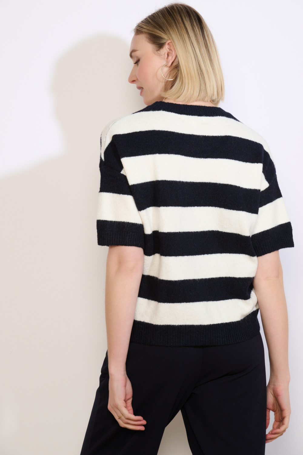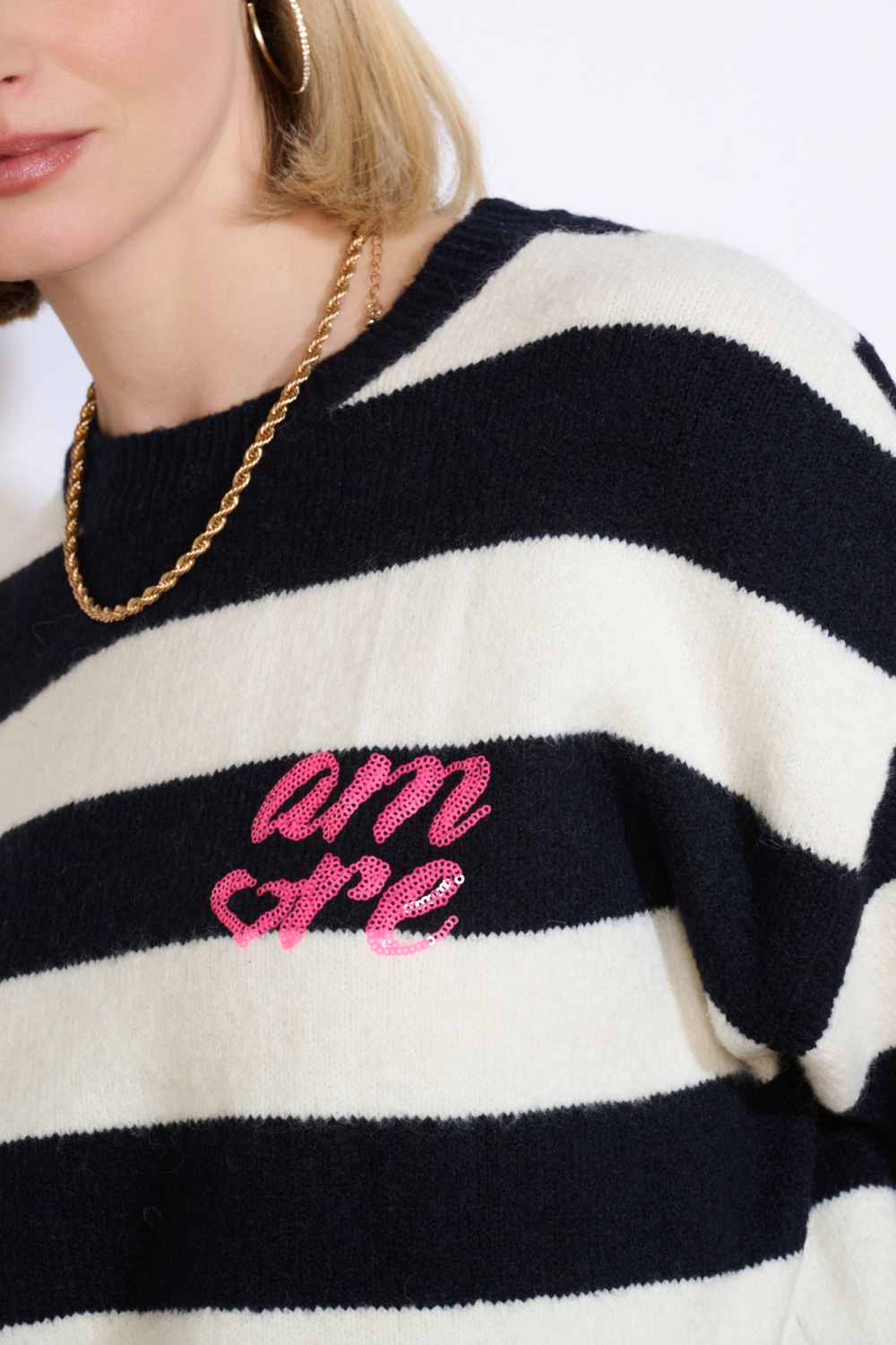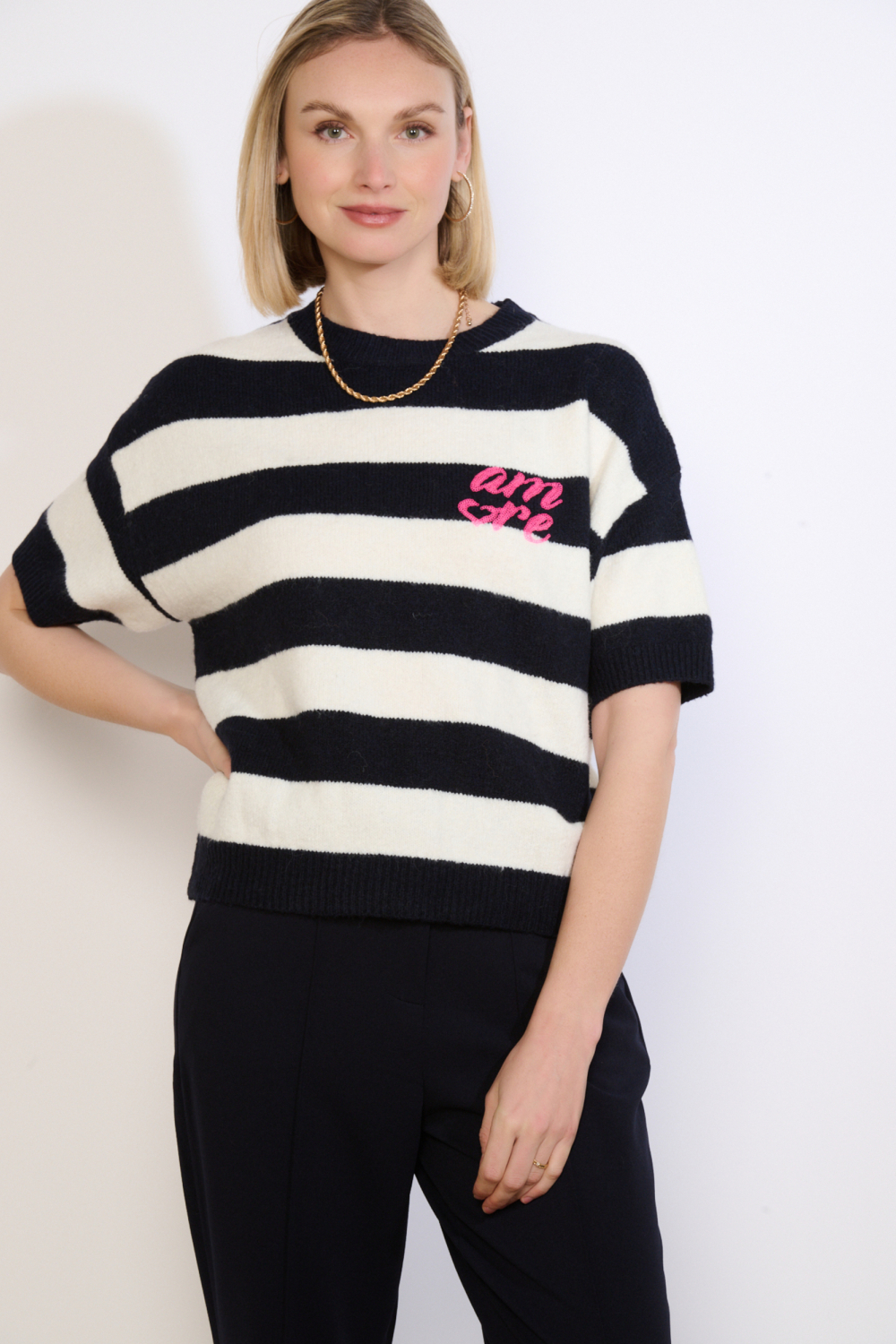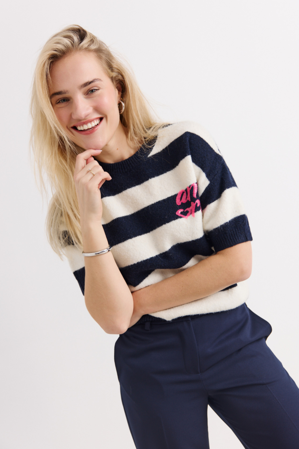Deze elegante trui van LolaLiza is een uitstekende keuze voor dames die houden van comfort en stijl. Het model heeft een regular fit pasvorm met korte mouwen, wat ideaal is voor het voorjaar. De opvallende strepen in marineblauw en wit geven de trui een moderne look, terwijl het roze geborduurde detail op de borst een speelse touch toevoegt. Met een ronde hals en een normale lengte, is deze trui perfect voor een casual dagje uit of een ontspannen middag op kantoor.