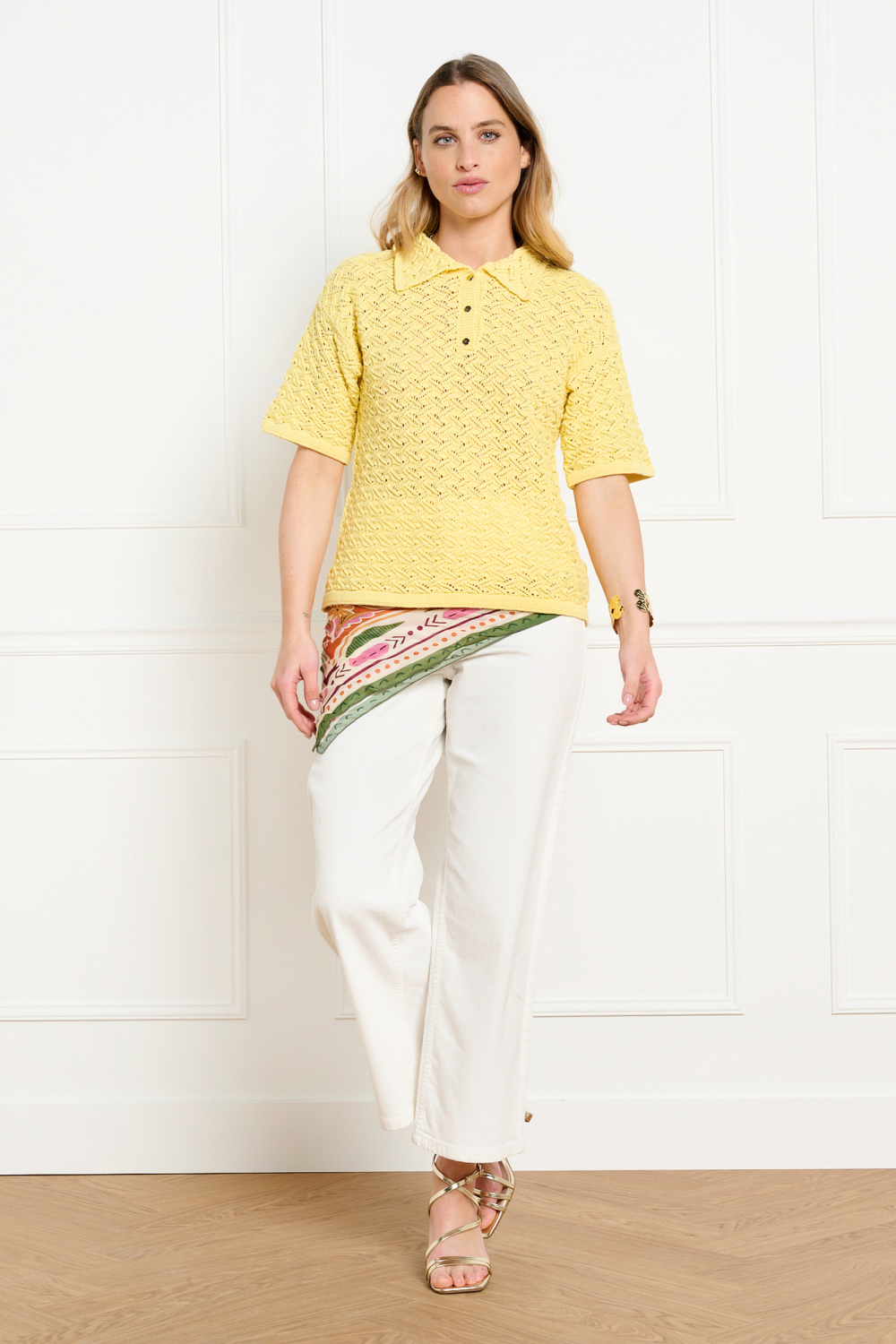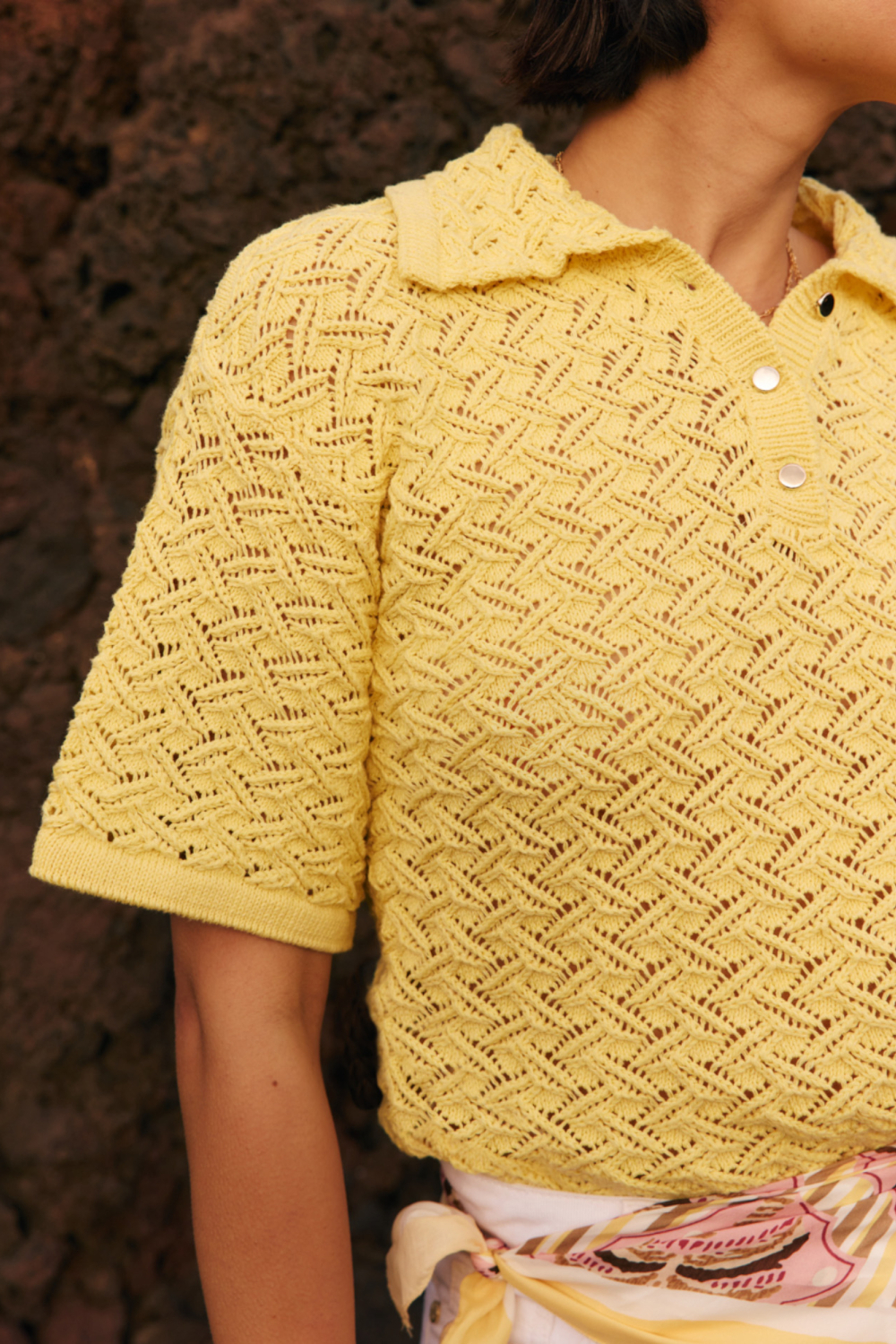 De LolaLiza trui is een zomers kledingstuk dat charme en comfort combineert. Met een structuurpatroon en een heldergele kleur, is deze trui een opvallende aanvulling op je garderobe. De combinatie van 50% acryl en 50% katoen zorgt voor een zachte en ademende stof, ideaal voor warme dagen. Deze trui heeft een regular fit waardoor hij comfortabel valt en geschikt is voor diverse lichaamstypes. De puntkraag en knoopsluiting geven de trui een verfijnde uitstraling, terwijl de 3/4 mouwen zorgen voor een casual look.