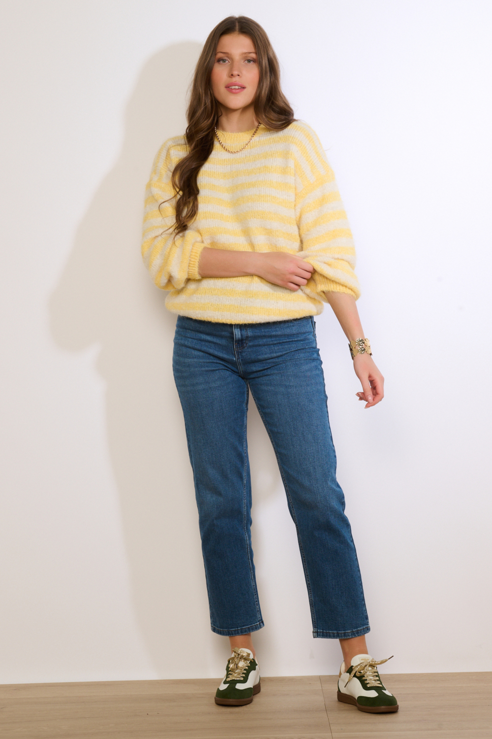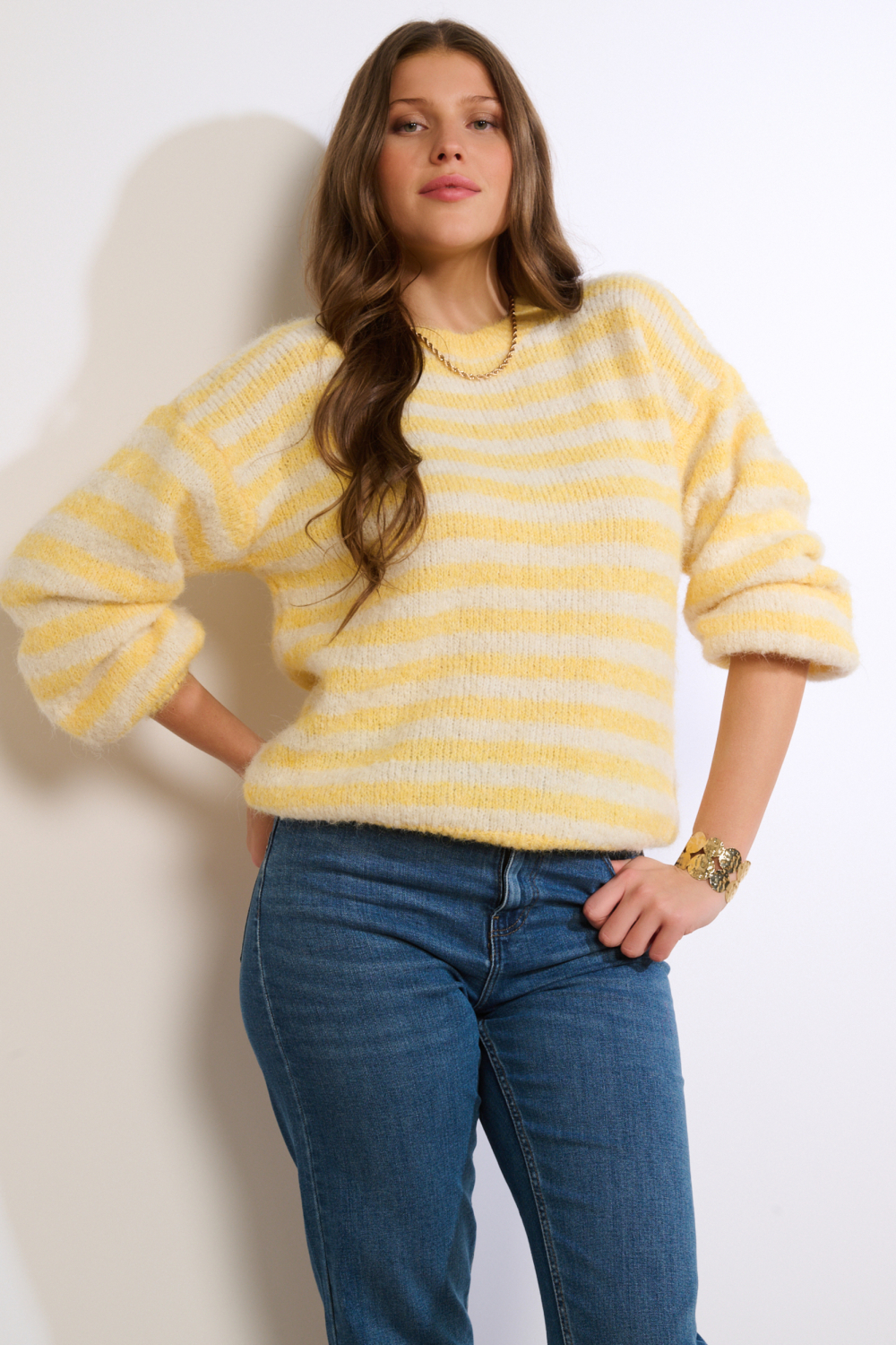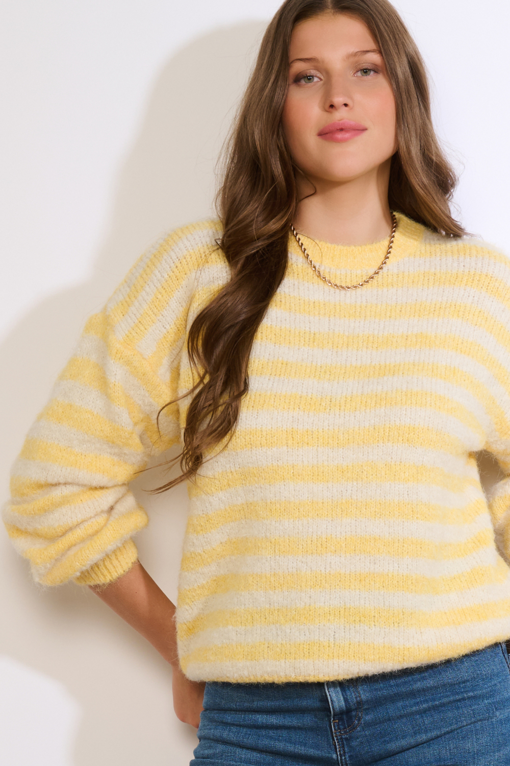 Deze stijlvolle streep trui van LolaLiza is een uitstekende keuze voor dames die houden van comfort en een casual uitstraling. Het breisel heeft een regular fit die jou een ontspannen gevoel geeft, terwijl de gele en witte strepen een speelse en frisse uitstraling bieden. De trui, met zijn ronde halslijn en lange mouwen, is ideaal voor het hele jaar door, en biedt zowel luchtigheid als warmte wanneer nodig. Met zijn basis en tijdloze design past deze trui gemakkelijk bij verschillende outfits. Draag hem met een jeans voor een gezellige dag met vriendinnen of combineer hem met een rok voor een meer geklede look. De zachte textuur en normale lengte maken het een veelzijdig kledingstuk dat geschikt is voor allerlei gelegenheden, van een ontspannen zondag thuis tot een informele bijeenkomst. Samengevat, een betrouwbare toevoeging aan jouw garderobe die gemakkelijk te stylen is en altijd in de mode blijft.