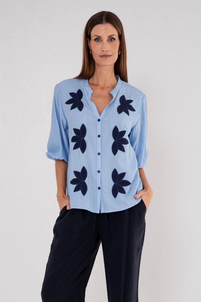Deze casual blouse van Maicazz is een veelzijdige keuze voor je zomergarderobe. Het lichtblauwe ontwerp, verrijkt met donkerblauwe bloemenapplicaties, geeft een speelse twist aan je outfit. De regular fit van de blouse zorgt voor een comfortabele pasvorm die niet alleen flatteert, maar ook geschikt is voor diverse lichaamstypes. Met een knoopsluiting en weloverwogen V-hals combineert dit kledingstuk moeiteloos stijl en gebruiksgemak. Gemaakt van 80% viscose en 20% nylon, voelt de stof zacht en luchtig aan, perfect voor warme dagen. De driekwart mouwen bieden een nonchalante uitstraling die ideaal is voor zowel informele als semi-formele gelegenheden. Deze blouse is gemakkelijk te combineren met een nette broek voor een zakelijke look, of met een casual jeans voor een relaxte dag. Dankzij de unieke structuur van de stof voeg je een extra dimensie toe aan je outfit, waardoor deze Maicazz blouse een onmisbare aanvulling is voor elke zomerse gelegenheid.