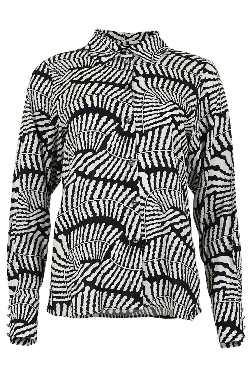 Deze casual damesblouse van Maicazz, in de kleur Off White Leaves, combineert comfort met een speelse grafische print. Gemaakt van 100% viscose, voelt de stof luchtig en zacht aan op de huid. De regular fit zorgt voor een ontspannen look die prettig draagt in het herfstseizoen. Met een klassieke puntkraag en een knoopsluiting is deze blouse een veelzijdige aanvulling op je najaarsgarderobe. De lange mouwen en normale lengte maken deze blouse geschikt voor zowel een relaxte dag thuis als een informele werk-setting. De unieke zwart-witte grafische patronen geven een moderne twist aan je outfit, terwijl de eenvoud van de snit veelzijdigheid biedt. Draag deze blouse met een donkere jeans of een nette broek voor een stijlvolle, casual look. Of je nu een dagje uit gepland hebt of het rustig aan doet, dit kledingstuk voegt altijd een vleugje verfijning toe aan je dagelijkse stijl.