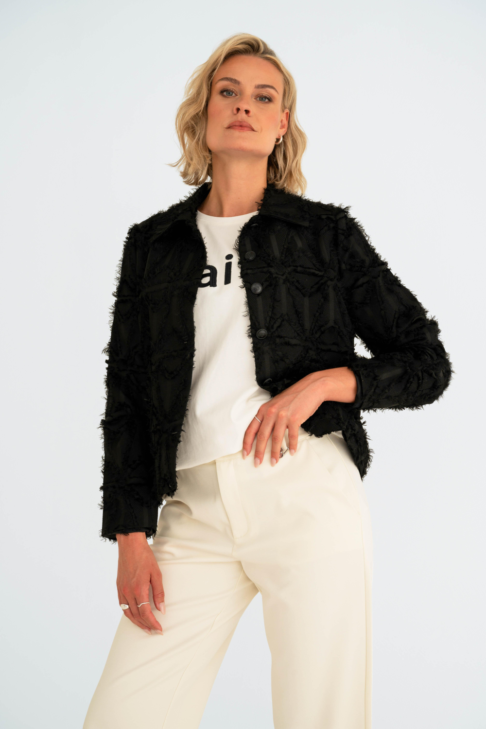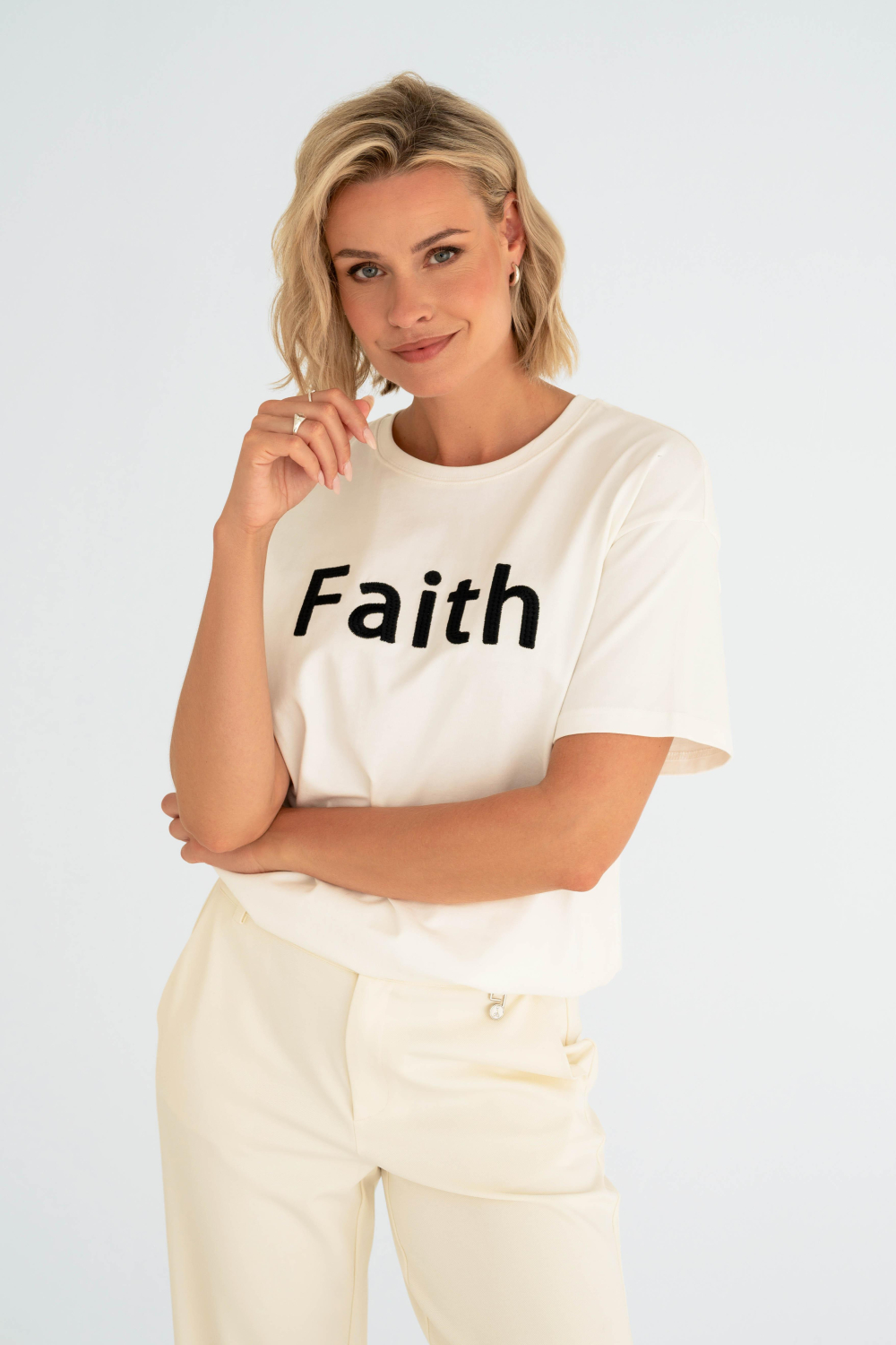 Dit casual off white T-shirt van Maicazz is een stijlvolle keuze voor elke lente-outfit. Gemaakt van 100% katoen, biedt het shirt een zachte en comfortabele pasvorm die prettig aanvoelt op de huid. Het kenmerkende "Faith" patroon op de voorkant geeft het T-shirt een moderne uitstraling. Met een ronde hals en korte mouwen is dit T-shirt ideaal voor een ontspannen dagje uit of een casual ontmoeting met vrienden. De reguliere pasvorm zorgt ervoor dat het gemakkelijk te combineren is met andere kledingstukken. Of je nu kiest voor een casual look met een jeans of iets eleganter met een rok en een jasje, dit Maicazz T-shirt voegt een vleugje stijl toe aan je outfit. De eenvoudige maar stijlvolle uitstraling maakt het geschikt voor diverse gelegenheden, of je nu een middag in de stad doorbrengt of een rustige dag in het park plant. Een veelzijdige aanvulling op elke garderobe, dit T-shirt combineert moeiteloos comfort met modieuze flair.