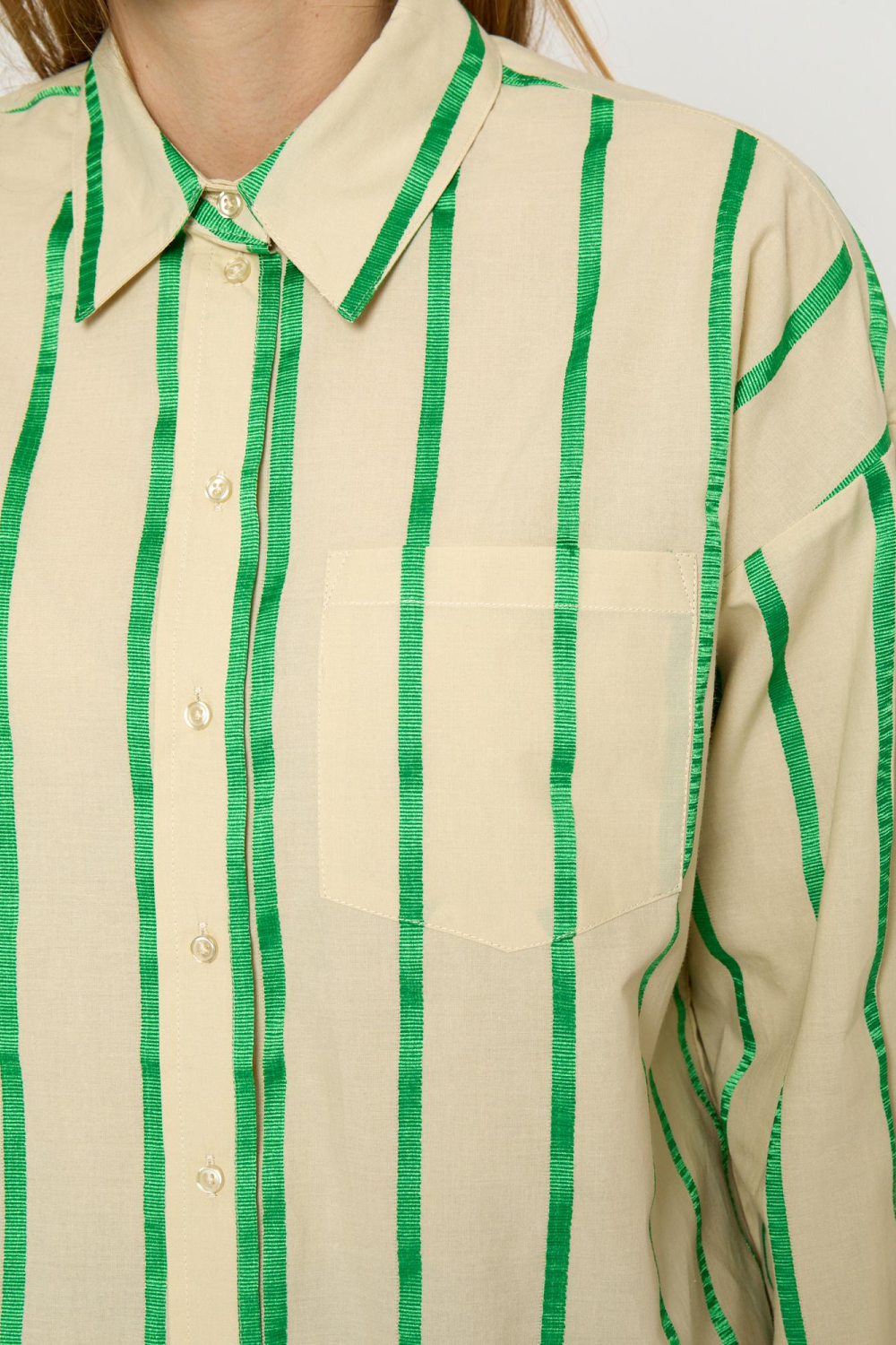 Deze casual blouse van Minus, met een frisse streep in groen op een beige achtergrond, voegt een modern tintje toe aan je garderobe. De oversized pasvorm maakt het een ontspannen keuze voor dagelijkse outfits, terwijl de puntkraag en knoopsluiting zorgen voor een klassieke afwerking. Gemaakt van 80% katoen en 20% polyester, biedt deze blouse een comfortabele en ademende stof die ideaal is voor lente dagen. De lange mouwen en de normale lengte geven dit kledingstuk veelzijdigheid, perfect voor dagelijkse gelegenheden of een informele afspraak. De borstzakken voegen een subtiel detail toe zonder afbreuk te doen aan de strakke look. Combineer deze blouse met een jeans voor een moeiteloos stijlvolle outfit of draag hem met een elegante rok voor een casual-chique uitstraling. Welke gelegenheid je ook kiest, deze Minus blouse is een vernieuwende aanvulling op je lente garderobe.