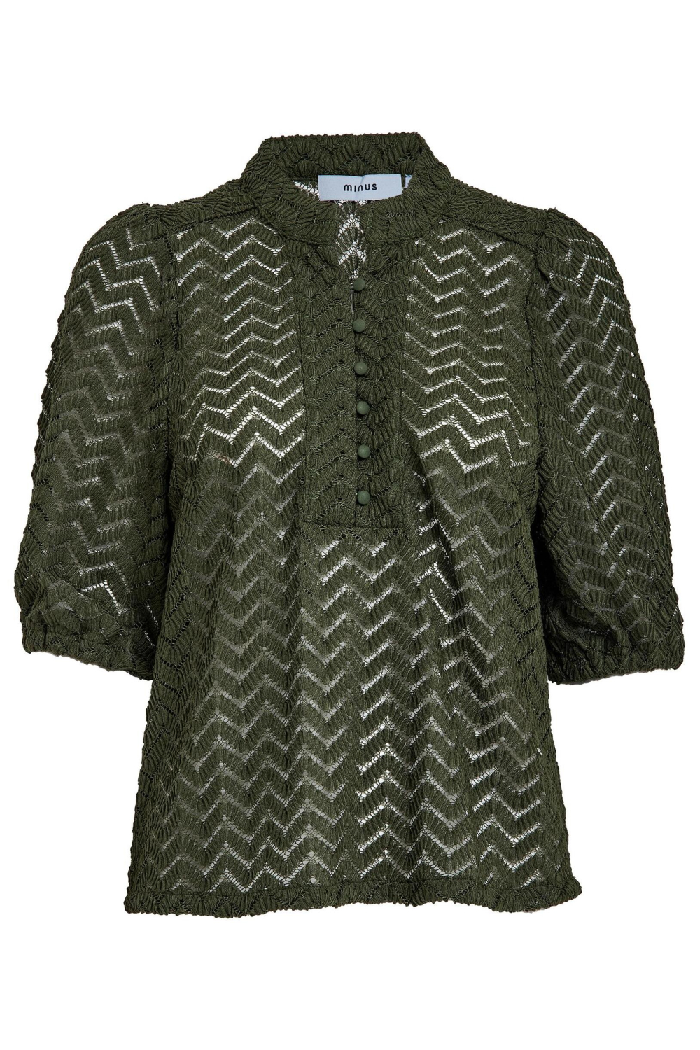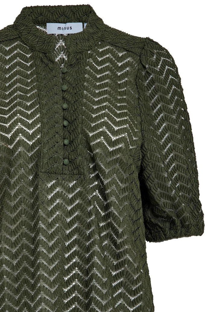 Deze stijlvolle Rifle Green blouse van Minus is een prachtige aanvulling op je herfstgarderobe. Het ajourpatroon geeft een unieke en verfijnde uitstraling, terwijl de ronde hals en de knoopsluiting voor een elegante afwerking zorgen. De blouse heeft een casual stijl en een regular fit, waardoor hij comfortabel draagt en gemakkelijk te combineren is met verschillende outfits.