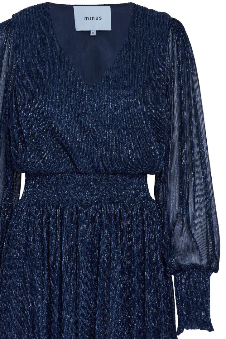 Deze stijlvolle jurk van Minus is een veelzijdige aanwinst voor je wintergarderobe. De jurk heeft een chique uitstraling door de subtiele glitters en de diepblauwe kleur '2994 SKY CAPTAIN'. De regular fit garandeert een comfortabele pasvorm die perfect om je lichaam valt. Het halflange ontwerp met de elegante V-hals straalt verfijning uit en biedt een tijdloze look voor elke gelegenheid.