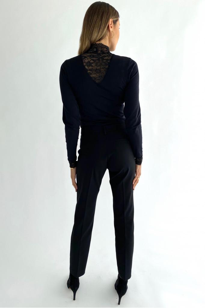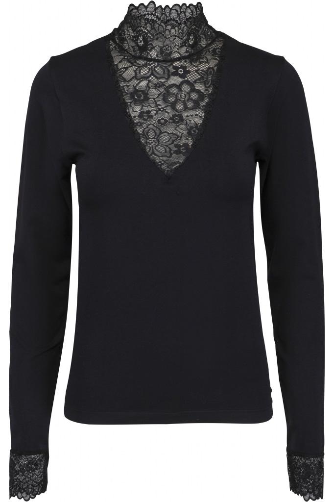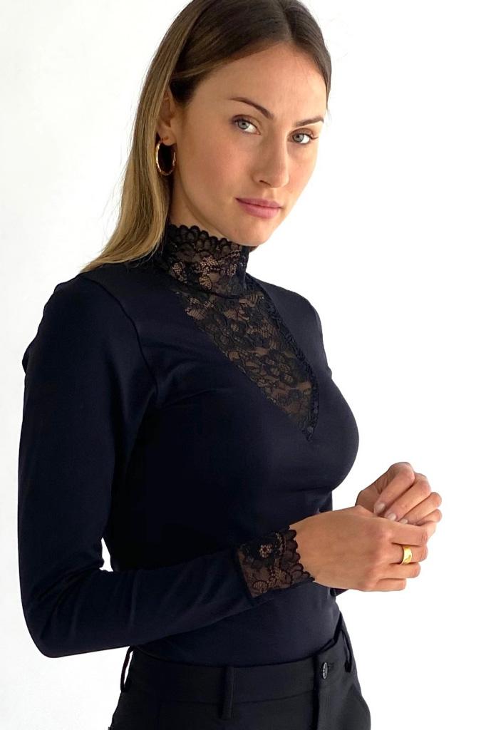 Dit elegante zwarte dames T-shirt van Minus straalt stijl en verfijning uit. De slim fit pasvorm en de high neck met kantdetails geven het een unieke uitstraling. Gemaakt van een zachte mix van 95% polyamide en 5% elastan, is dit T-shirt perfect voor casual gelegenheden. De lange mouwen met kanten accenten maken het tot een stijlvolle keuze voor zowel overdag als 's avonds. Dankzij het tijdloze design van dit basisstuk kun je het makkelijk combineren met zowel een chique pantalon als je favoriete jeans. Dit Minus T-shirt voegt net dat beetje extra toe aan je outfit, of je nu een dag op kantoor hebt of een avondje uit gaat. De kant zorgt voor een subtiele maar opvallende touch, waardoor je altijd verzekerd bent van een moderne look. Een essentieel item dat niet in je garderobe mag ontbreken.