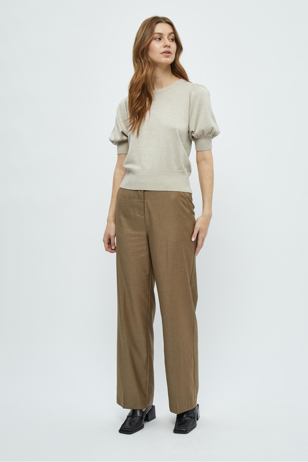 Deze stijlvolle sand gray melange trui van Minus is een must-have voor de modebewuste vrouw. Het gemêleerde patroon in combinatie met de ronde hals en korte mouwen geeft een moderne en verfijnde uitstraling. Gemaakt van een duurzame mix van 82% Viscose Lenzing Ecovero en 18% Elastan, biedt deze trui zowel comfort als een milieuvriendelijke keuze. De regular fit en normale lengte zorgen voor een tijdloze en comfortabele pasvorm die gemakkelijk in elke garderobe past. Je kunt deze trui perfect dragen tijdens een koele herfstdag of informele bijeenkomsten. De subtiele puff sleeves voegen een vleugje elegantie toe, terwijl de geribde boorden voor een nette afwerking zorgen. Combineer hem met een casual jeans of een nette pantalon voor een veelzijdige look die zowel geschikt is voor een dag op kantoor als een ontspannen avondje uit. Met deze trui voeg je een veelzijdig en stijlvol stuk toe aan je kledingkast.