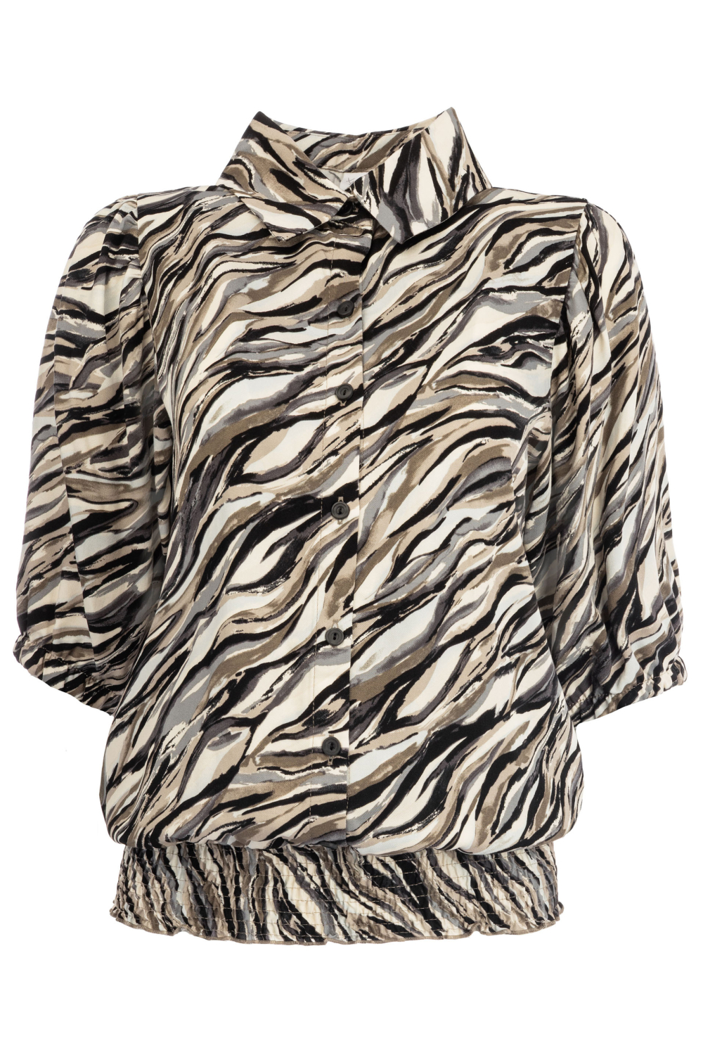 Deze stijlvolle blouse van NED is een perfecte keuze voor een casual, maar verfijnde look. De blouse is gemaakt van 100% viscose, waardoor hij zacht en comfortabel aanvoelt. Het opvallende grafische patroon in zandkleur geeft een trendy en dynamische uitstraling. Het high neck ontwerp, gecombineerd met een knoopsluiting, voegt een elegant detail toe dat bij verschillende gelegenheden past. Dankzij de reguliere pasvorm en de 3/4 mouwlengte is deze blouse een ideale toevoeging aan je garderobe voor elk seizoen. De blouse leent zich uitstekend voor zowel informele als iets formelere settings. Draag hem met een spijkerbroek voor een ontspannen dagje uit, of combineer hem met een nette broek voor een zakelijke bijeenkomst. De normale lengte en het eenvoudige onderhoud maken het een praktische keuze voor dagelijks gebruik. Deze NED blouse biedt je een veelzijdige optie die jouw persoonlijke stijl moeiteloos aanvult.