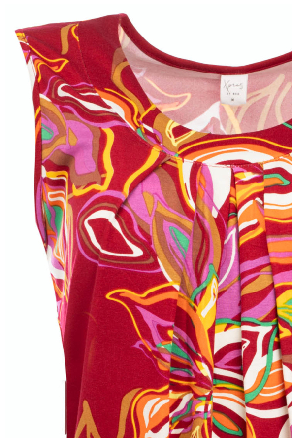 Deze kleurrijke dames top van NED is de perfecte aanvulling voor je casual garderobe. De rode basis met een gedurfd grafisch patroon van paarse, oranje en groene tinten maakt deze top een echte blikvanger. Gemaakt van 95% viscose en 5% elastan, biedt dit kledingstuk een comfortabele, soepele pasvorm voor dagelijks gebruik. De ronde hals en mouwloze snit zorgen voor een luchtige feel, ideaal voor warmere dagen of als stijlvolle laag onder een blazer. Dankzij de regular fit en normale lengte is de top makkelijk te combineren met jeans of een rok, waardoor hij geschikt is voor verschillende gelegenheden. Of je nu een informele brunch plant of een ontspannen dagje uit, deze NED top voegt moeiteloos kleur en flair toe aan je outfit. Het unieke ontwerp en de hoogwaardige materialen maken het een veelzijdige keuze die je het hele jaar door kunt dragen.