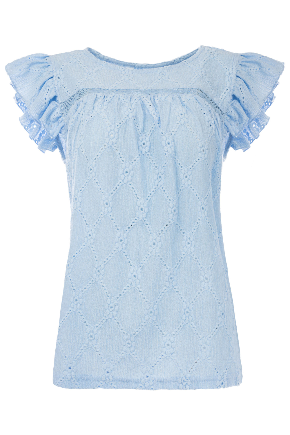 Deze prachtige ajour top van NED is een stijlvolle toevoeging aan jouw lente garderobe. Gemaakt van 99% polyester en 1% elastan, zit deze top comfortabel en biedt hij een lichte stretch. De pastelblauwe kleur en het subtiele ajour patroon geven het een frisse en zachte uitstraling. De kap mouwtjes met ruches voegen een romantisch detail toe dat je look net dat beetje extra geeft. De ronde hals maakt deze top veelzijdig voor diverse gelegenheden. Of je nu een casual dagje hebt of een iets formelere gelegenheid, deze top past perfect bij beide. Combineer hem met een jeans voor een ontspannen look of draag hem met een rok voor een elegantere uitstraling. Door de regular fit en normale lengte heb je een comfortabele en flatterende pasvorm die de hele dag goed aanvoelt.