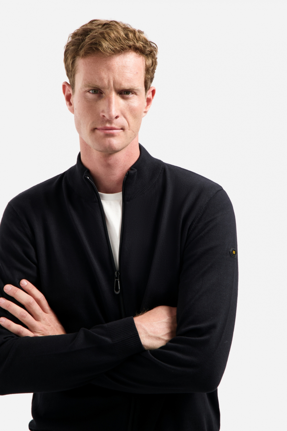 Fijngebreid vest van No-Excess met lange mouwen en een highneckkraag. Dit model sluit met een rits en is afgewerkt met ribgebreide boorden.