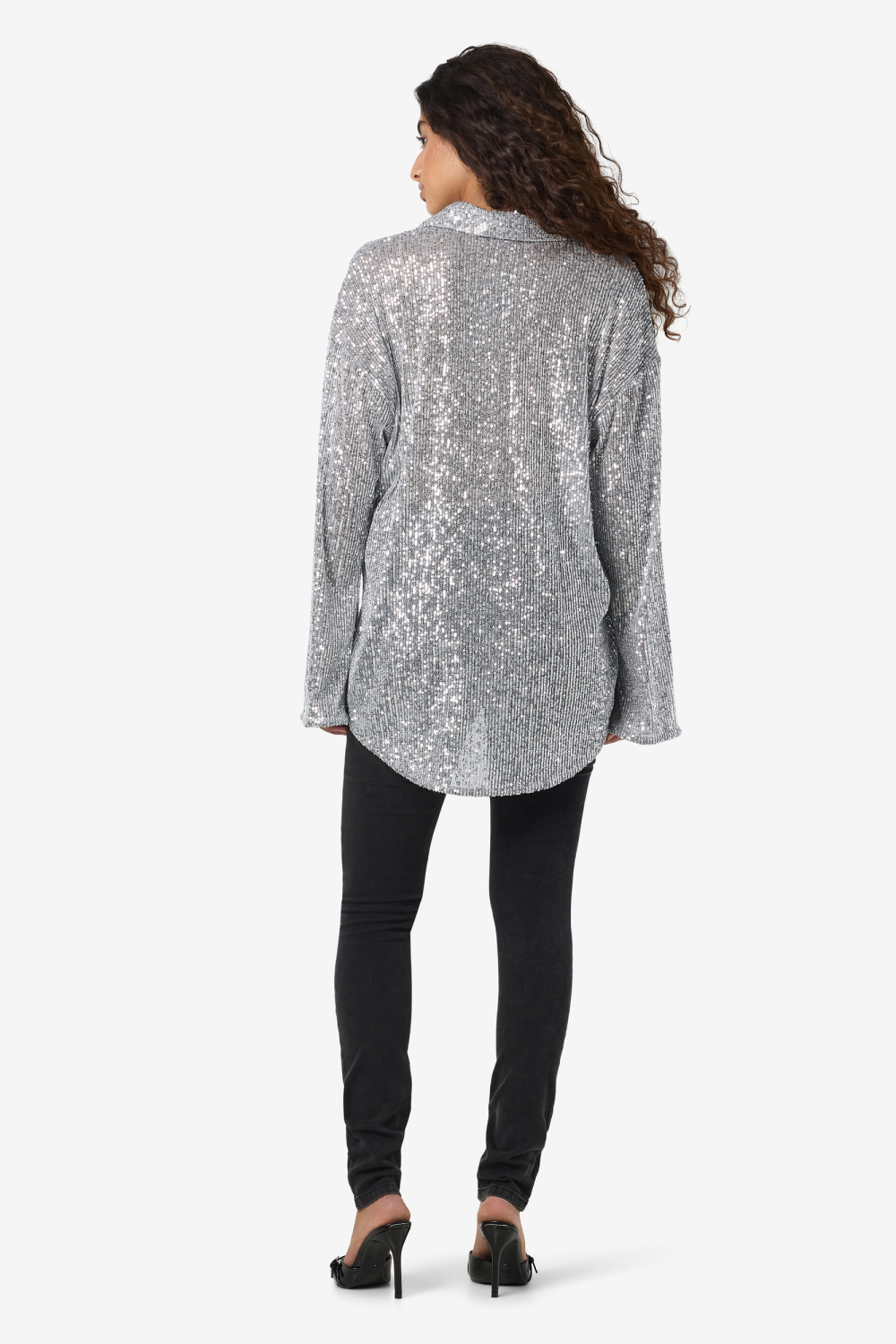 Deze opvallende blouse van Noisy may wordt gekenmerkt door zijn sprankelende ontwerp, perfect voor feestelijke gelegenheden. De blouse is zilverkleurig en volledig bedekt met pailletten, wat zorgt voor een glanzende en levendige uitstraling. De drukknoopsluiting en de klassieke puntkraag geven een subtiele verfijning aan dit opvallende stuk. De regular fit en de lange mouwen maken het tot een comfortabele keuze voor een avondje uit of een speciale gelegenheid in de wintermaanden.