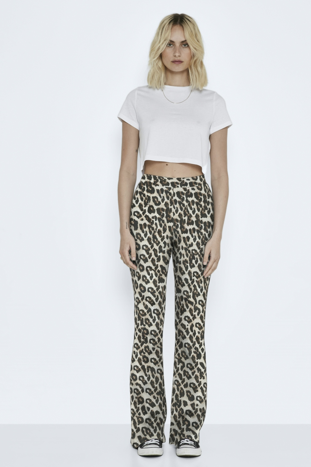 Deze trendy flared broek van Noisy may geeft jouw zomergarderobe een speelse touch. De broek heeft een opvallend animal printpatroon dat stijl toevoegt aan elke outfit. Gemaakt van 57% organisch katoen, 38% modal en 5% elastan, biedt het een comfortabele pasvorm die de hele dag goed zit. Dankzij de elastische boord trek je hem makkelijk aan, ideaal voor een casual dagje uit of een relaxt avondje thuis. De flared snit leent zich perfect voor een modieuze look, of je nu een wandeling maakt in de stad of ontspant op een terrasje. Deze broek is gemakkelijk te combineren met zowel effen tops als basic sneakers, zoals te zien op de foto's. De normale lengte maakt het geschikt voor diverse lichaamslengtes, terwijl het materiaal zorgt voor een ademend gevoel tijdens warmer weer. Voeg deze veelzijdige broek toe aan je collectie voor een frisse, casual stijl.