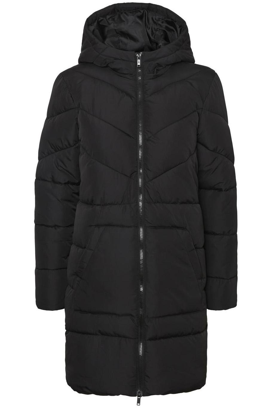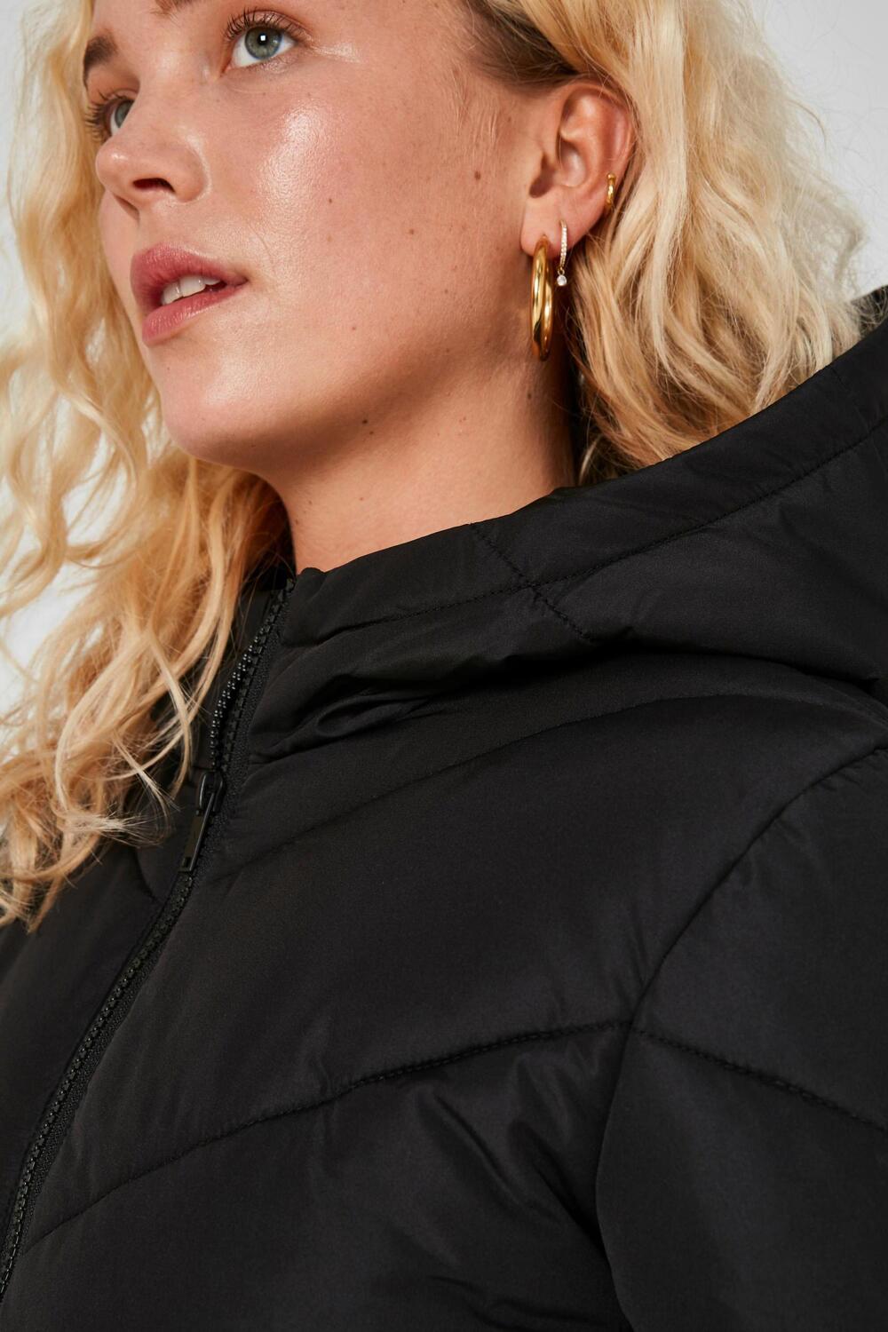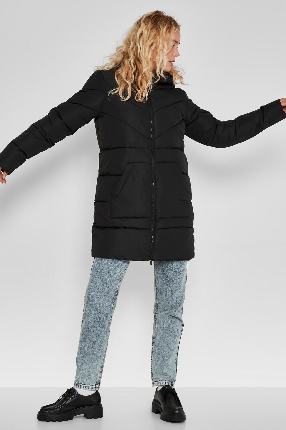 Halflange gewatteerde winterjas van Noisy May. Dit model heeft lange mouwen en een vaste capuchon. De jas sluit met een rits en heeft twee steekzakken aan de voorkant.