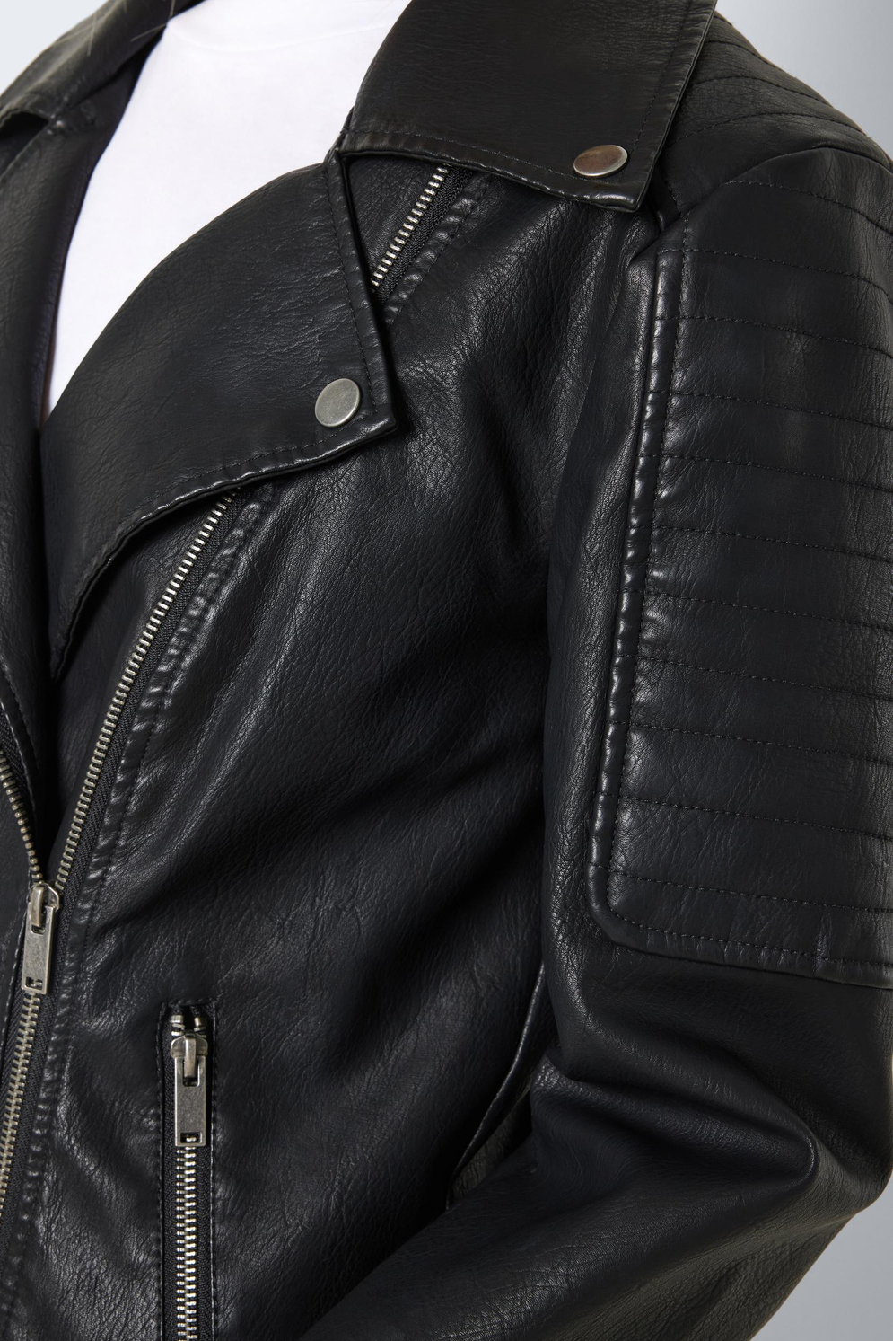 Stoere bikerjas van imitatieleer. Dit model heeft 2 ritszakken aan de voorkant. Daarnaast sluit dit model met een asymmetrische rits.