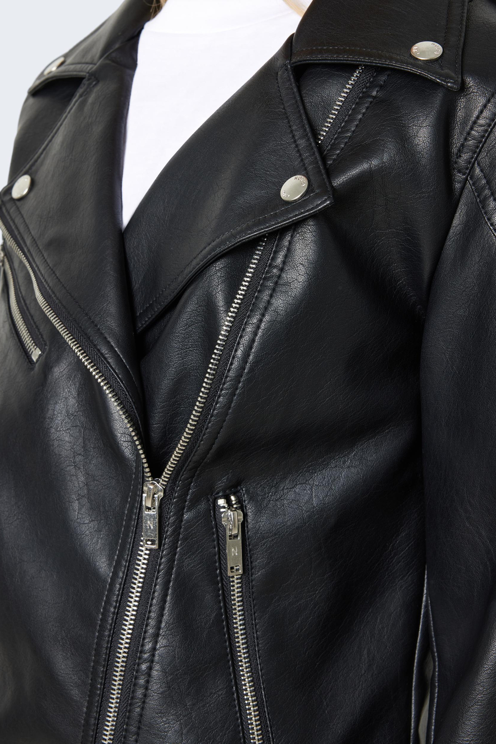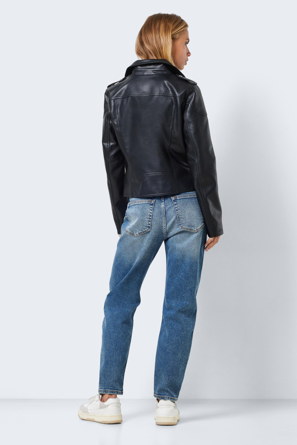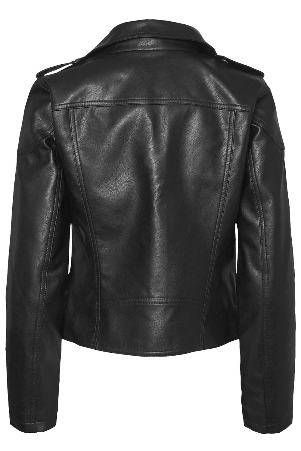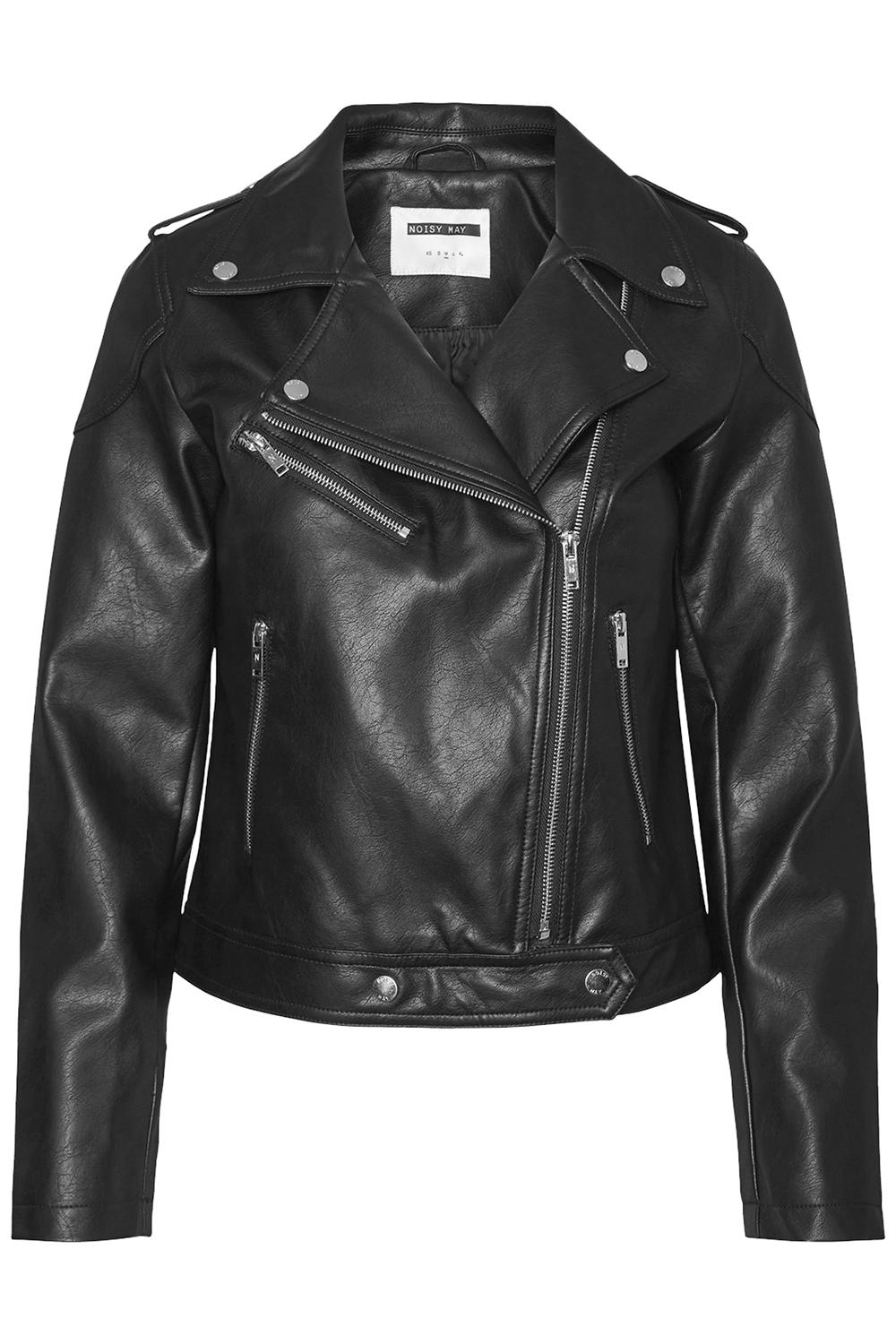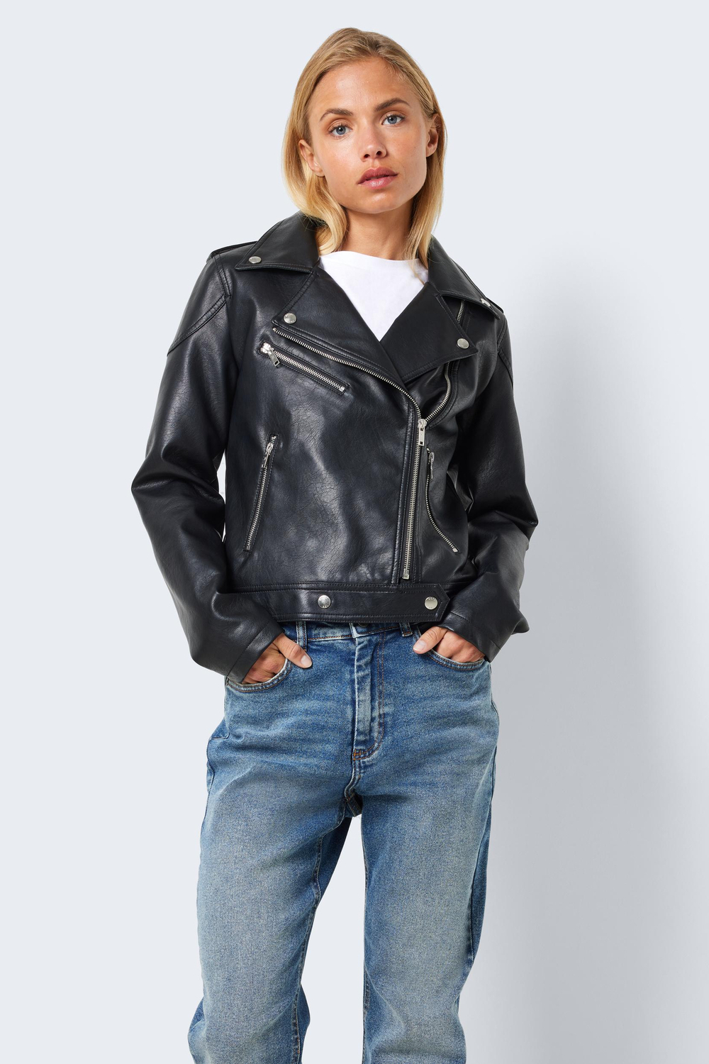 Imitatie lederen jas van Noisy May welke normaal valt. De jas heeft iets een asymmetrische rits en ritszakken aan de voorkant.