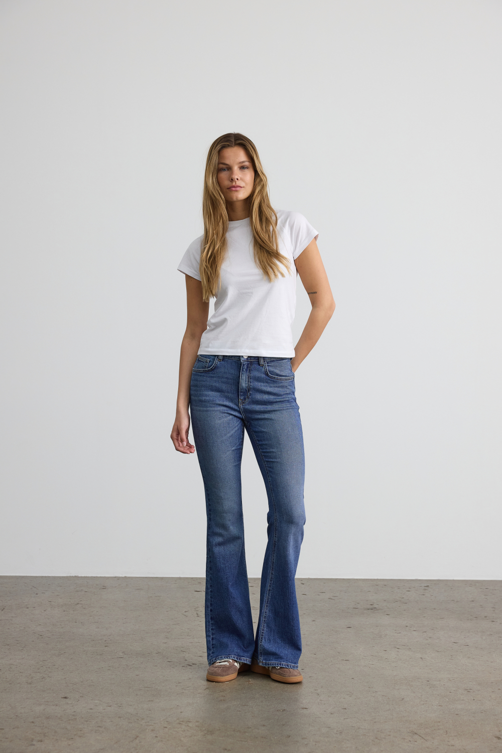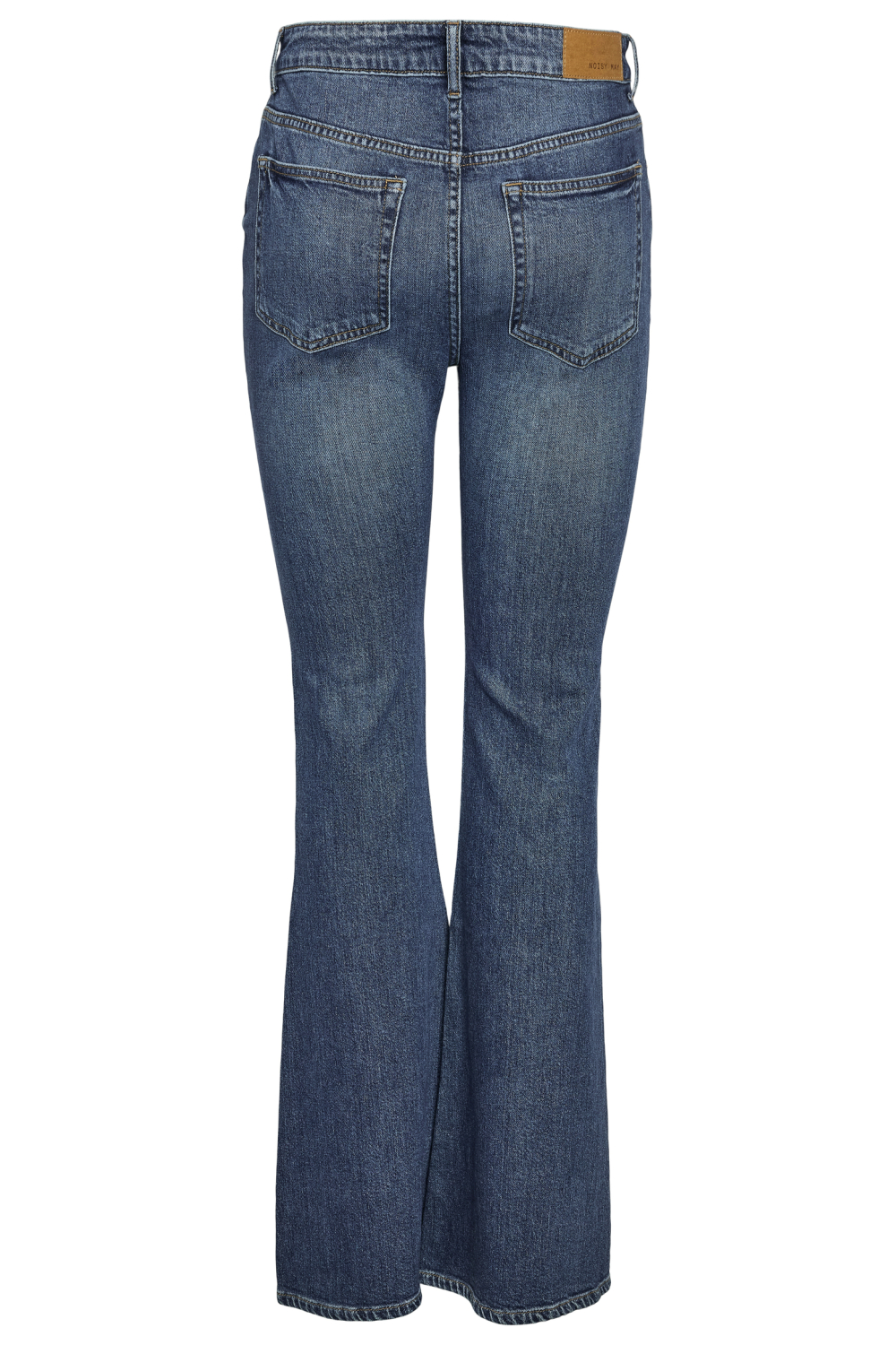 Deze medium blauwe flared jeans van Noisy May is een perfecte keuze voor elke gelegenheid. De jeans combineert een klassieke 5-pocket stijl met een moderne high waist pasvorm, die je figuur prachtig accentueert. Gemaakt van 99% katoen en 1% elastaan, biedt de denim stof precies genoeg stretch voor een comfortabele dag. De knoop- en ritsluiting voegt eenvoud toe, terwijl de lichte verkleuringen op de dijen een subtiele vintage look creëren. Met de flared pasvorm is deze jeans een veelzijdige aanvulling voor je garderobe. Combineer hem met een casual T-shirt voor een ontspannen look of draag hem met een nette blouse voor een stijlvol avondje uit. De normale lengte zorgt ervoor dat de jeans mooi valt over je schoenen, waardoor hij zowel met sneakers als hakken een goede match is. Of je nu naar een informele bijeenkomst gaat of een dagje uit plant, deze jeans biedt een stijlvolle en comfortabele optie.