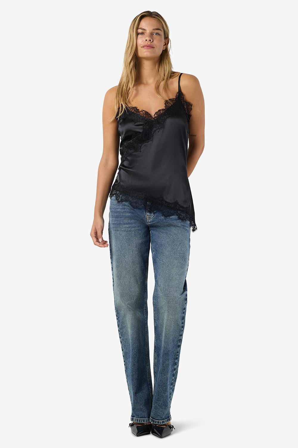 Deze zwarte Noisy may top is een elegante toevoeging aan je wintergarderobe. Met een vrouwelijke V-hals en verfijnde kantdetails voegt het een vleugje verfijning toe aan elke outfit. De regular fit en spaghettibandjes maken het een comfortabel en veelzijdig stuk voor diverse gelegenheden. Gemaakt van 95% polyester en 5% elastaan, biedt deze top een zachte en soepele stof die prettig aanvoelt op de huid en zorgt voor een mooie pasvorm. Combineer deze casual top moeiteloos met een jeans voor een ontspannen weekendlook of draag hem onder een blazer voor een chique avondje uit. De subtiele glans en kant geven je outfit direct een feestelijke uitstraling, waardoor het ook een goede keuze is voor speciale gelegenheden. Of je nu naar een brunch gaat met vrienden of een avondje uit plant, met deze top van Noisy may ben je altijd stijlvol gekleed.