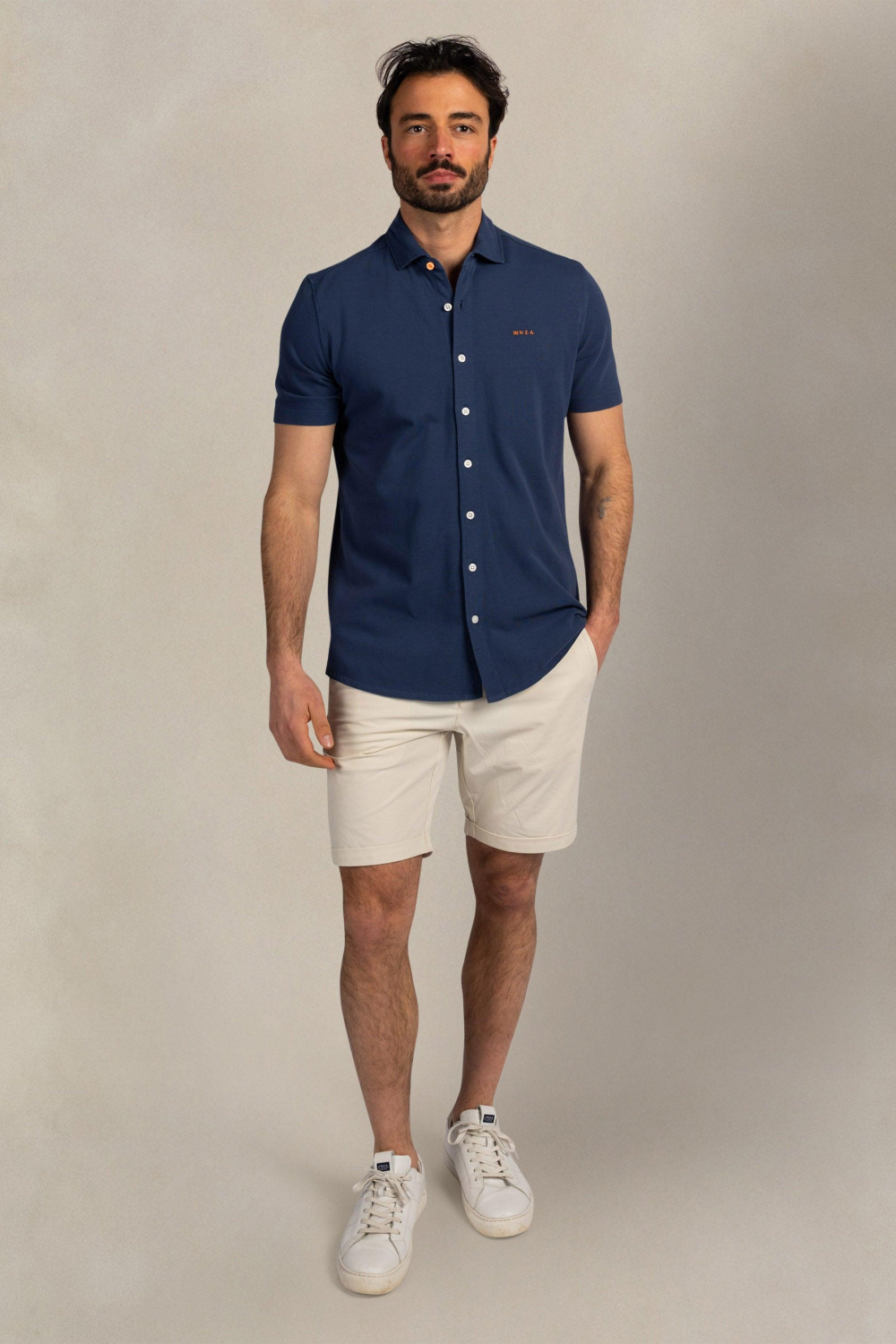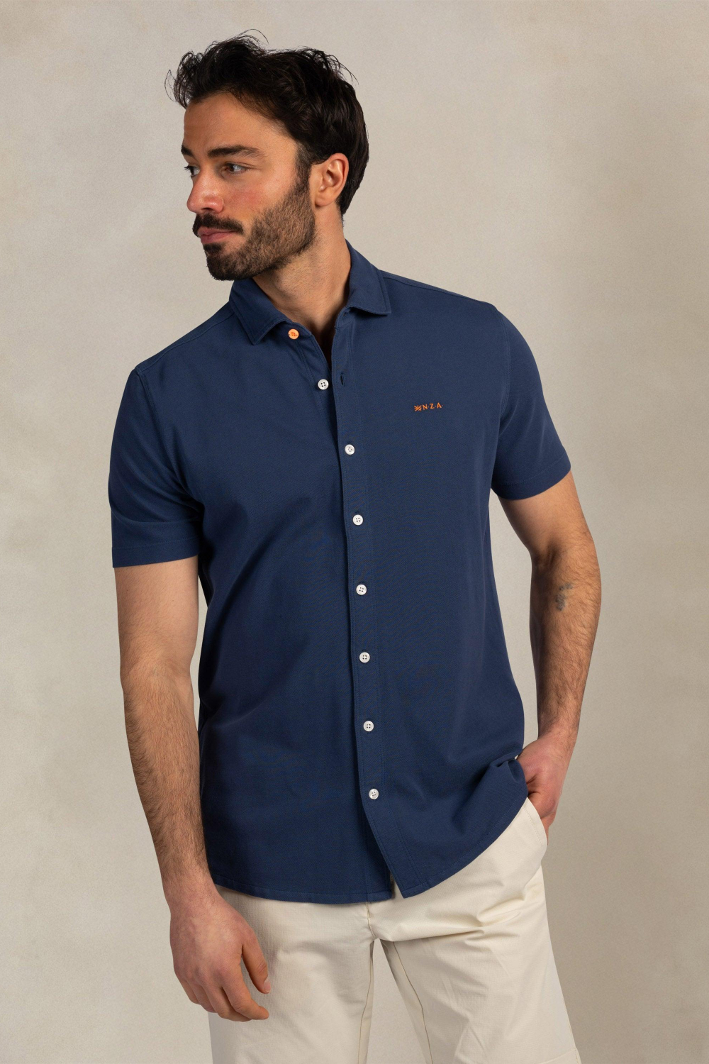 Dit casual NZA overhemd voor heren is perfect voor de lente. Gemaakt van 100% katoen, biedt het ademend comfort en een ontspannen regular fit. Het diepblauwe ontwerp straalt eenvoud en stijl uit, met een subtiel oranje NZA-logo op de borst dat een speels contrast toevoegt. De puntkraag en de nette knoopsluiting geven het een klassieke uitstraling, en de korte mouwen maken het uiterst draagbaar voor warmere dagen. Het NZA overhemd met korte mouw is veelzijdig te combineren met zowel een nette broek als een casual jeans, ideaal voor diverse gelegenheden. Of je nu een informele lunch met vrienden hebt of een ontspannen dag op kantoor, dit overhemd biedt altijd een vleugje verfijnde eenvoud. De normale lengte en het stevige katoenmateriaal zorgen ervoor dat het mooi in model blijft, zelfs na intensief dragen. Voeg dit veelzijdige stuk toe aan je voorjaarsgarderobe voor een moeiteloze en stijlvolle look.