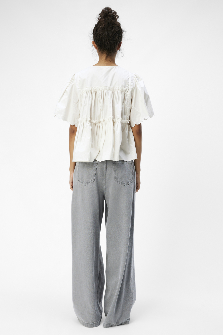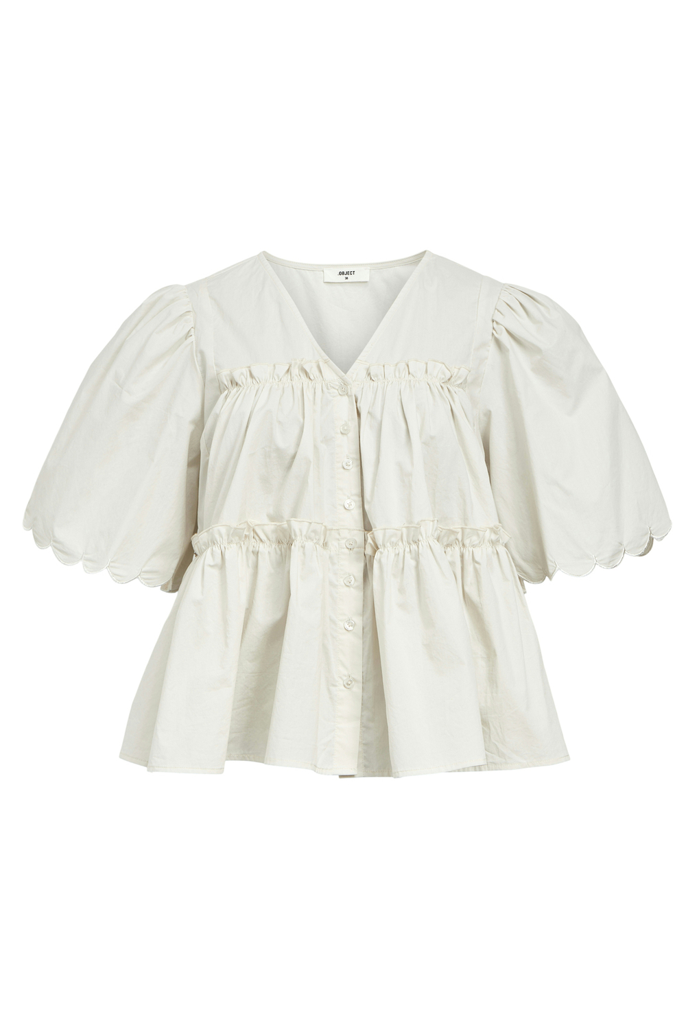 Deze casual blouse van Object, uitgevoerd in de kleur "white sand", is een topper in je zomergarderobe. Het ontwerp met een elegante V-hals en een knoopsluiting geeft een verfijnde uitstraling. Gemaakt van 50% biologisch katoen en 50% regulier katoen, biedt deze blouse een luchtige en duurzame draagervaring. De korte mouwen met subtiele ruches zorgen voor een speelse touch, terwijl de regular fit je een comfortabele pasvorm garandeert.
