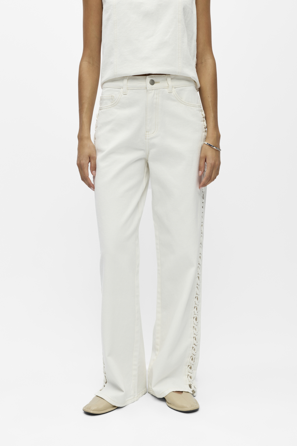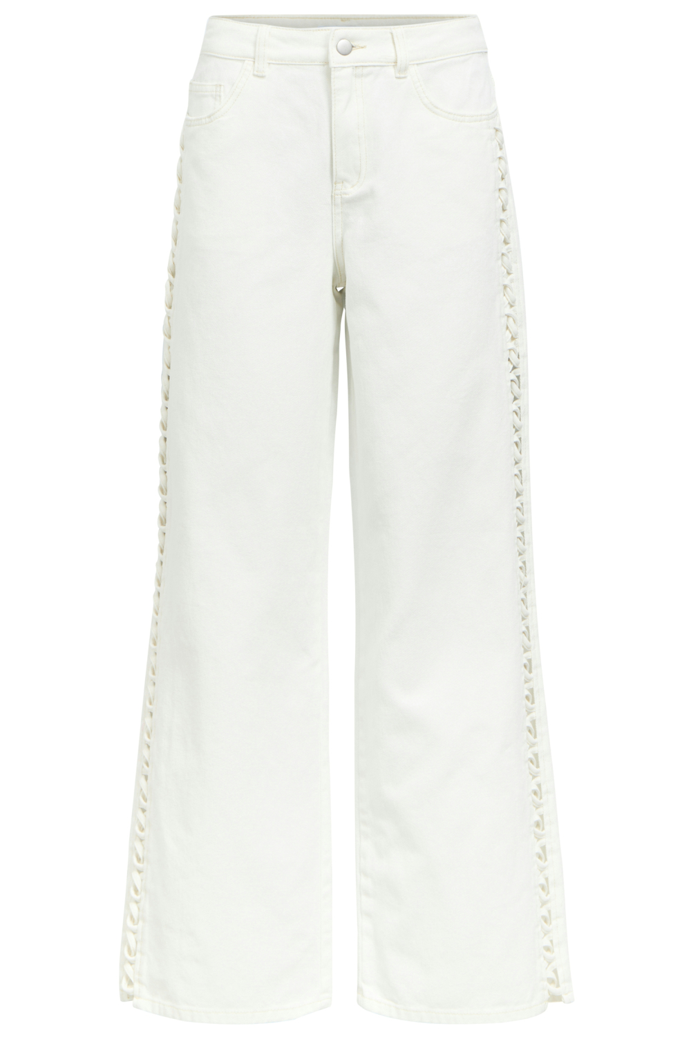 Deze stijlvolle witte jeans van Object is een veelzijdige aanvulling op je zomergarderobe. Met een comfortabele wide leg pasvorm en een regular waist, biedt deze jeans zowel stijl als draaggemak. De subtiele rinsewash wassing zorgt voor een frisse uitstraling die past bij elke zomerse gelegenheid. Aan de zijkanten vind je een unieke gevlochten detail die de jeans een speelse twist geeft zonder te overheersen. Gemaakt van 50% katoen en 50% biologisch katoen, voel je je goed over je keuze voor duurzaamheid. Deze jeans is ideaal voor een casual dagje uit, maar kan ook moeiteloos gecombineerd worden voor een wat meer geklede gelegenheid. De 5-pocket styling en de praktische knoop- en ritssluiting maken het ontwerp compleet, waardoor je de hele dag comfortabel kunt bewegen. Of je nu een middag op het terras doorbrengt of een zomerse wandeling maakt, deze jeans biedt de perfecte balans tussen stijl en comfort.