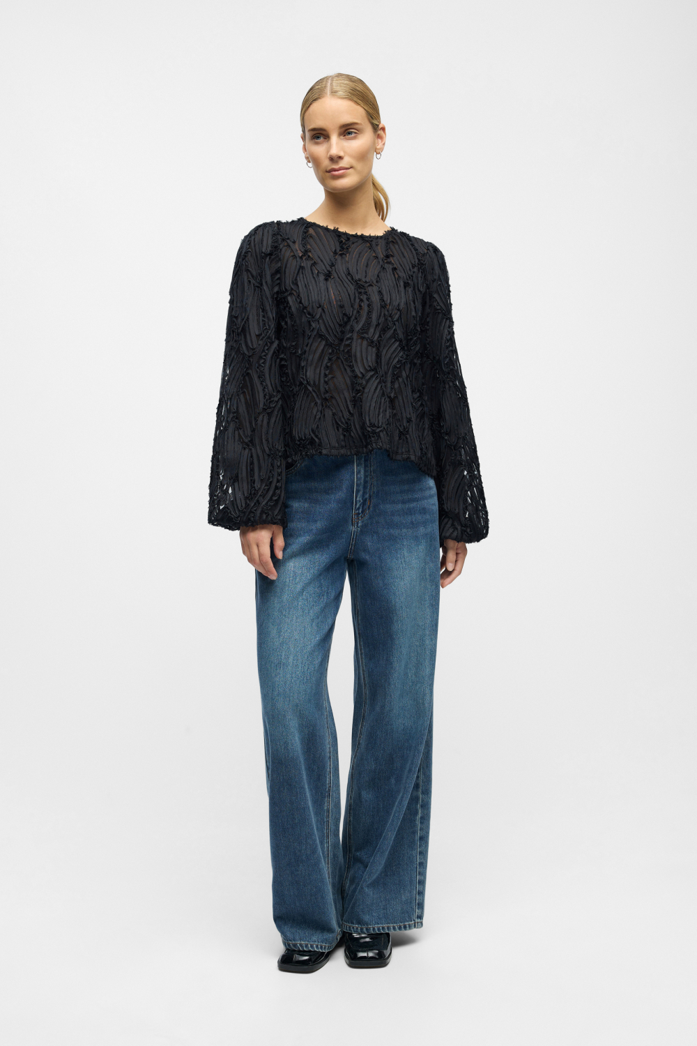 Ontdek de elegante zwarte blouse van Object, perfect voor de wintercollectie. Gemaakt van 50% gerecycled polyester en 50% polyester, biedt deze blouse niet alleen een moderne uitstraling maar draagt ook bij aan duurzaamheid. Het ontwerp is voorzien van een unieke structuur in de stof, waardoor het geheel een bijzondere textuur krijgt. De regular fit pasvorm en de ronde halslijn zorgen voor een comfortabele pasvorm die altijd in de mode blijft. De knoopsluiting aan de achterkant voegt een subtiel detail toe. Of je nu naar kantoor gaat of een casual bijeenkomst hebt, deze blouse is een veelzijdige keuze. Het normale model en de lange mouwen maken het ideaal voor de koelere dagen. Combineer het met een nette broek voor een zakelijke look of draag het met je favoriete jeans voor een ontspannen outfit. De stijlvolle uitstraling en veelzijdige toepassing maken deze blouse een essentiële aanvulling voor elke garderobe.