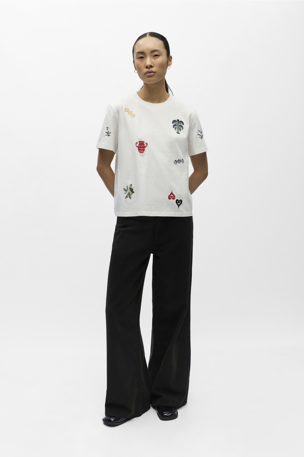 Dit casual dames T-shirt van Object is een speelse toevoeging aan je wintergarderobe. Gemaakt van 100% katoen, zorgt het voor draagcomfort en een ademend gevoel. Het witte shirt wordt subtiel geaccentueerd door diverse grafische patronen, waaronder een kleurrijke palmboom en andere opvallende motieven die karakter toevoegen. De ronde hals en de korte mouwen maken het tot een veelzijdig kledingstuk dat gemakkelijk gecombineerd kan worden voor een ontspannen dagje uit. Of je nu door de stad struint of van een relaxte middag in het park geniet, dit T-shirt biedt zowel stijl als gemak.