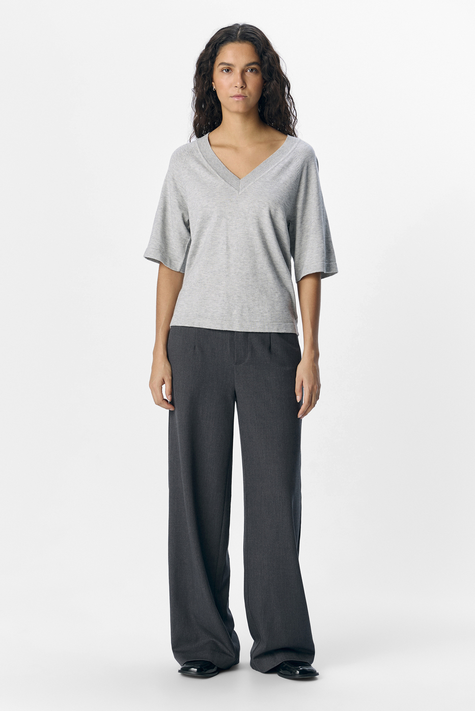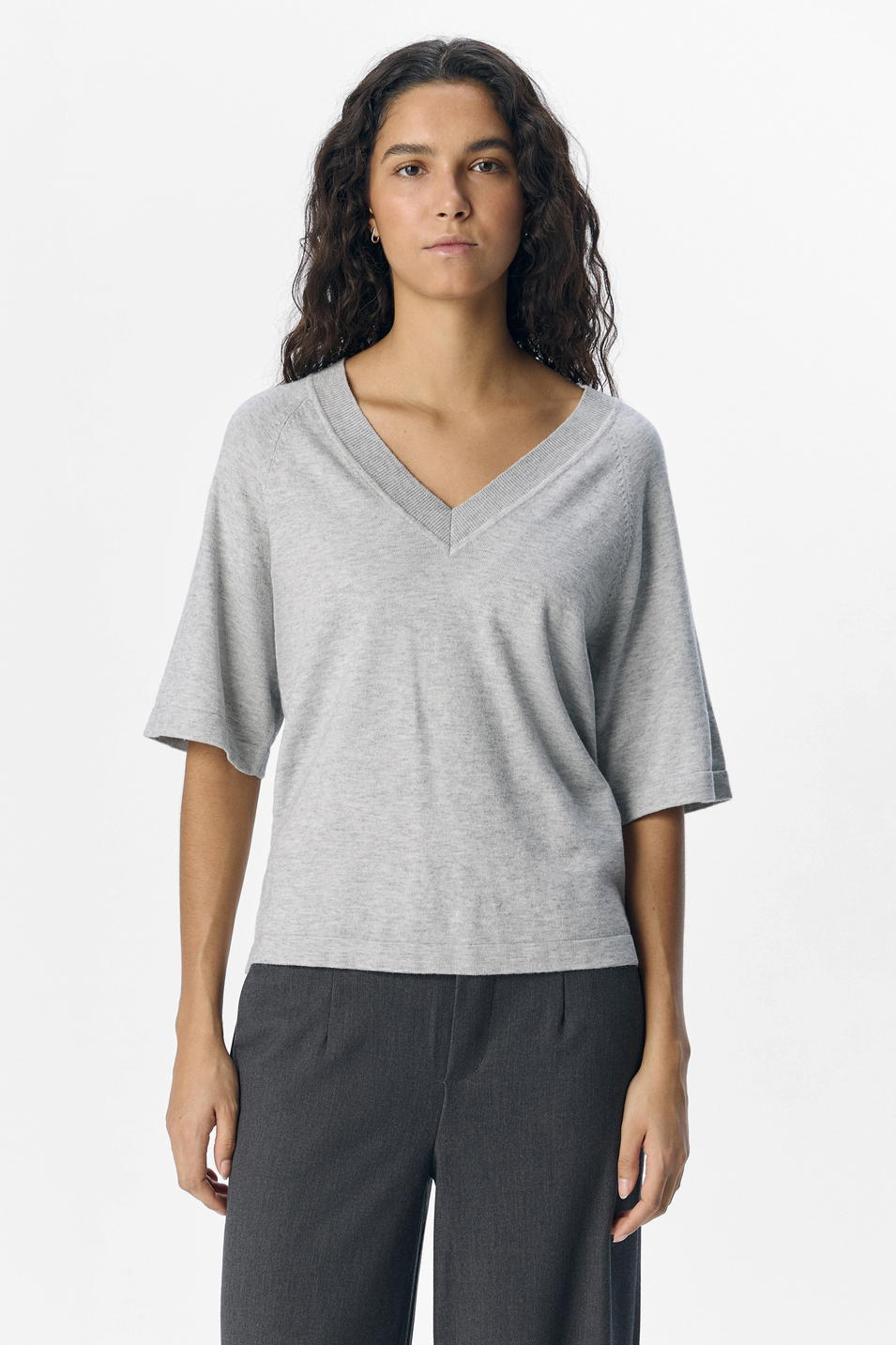 Deze lichtgrijs gemêleerde damestrui van Object is een veelzijdige toevoeging aan je lente garderobe. Met een regular fit en een elegante V-hals, biedt deze trui een frisse en moderne uitstraling. De combinatie van 50% viscose, 27% nylon en 23% gerecycled polyester zorgt voor een zachte en comfortabele stof, ideaal voor dagelijks gebruik. De korte mouwen geven een luchtige en casual touch, perfect voor de mildere lentedagen als je iets comfortabels wilt dragen. Door de subtiele kleur past deze trui gemakkelijk bij verschillende stijlen en gelegenheden. Combineer hem met een nette pantalon voor een zakelijke look of draag hem met een jeans voor een ontspannen dagje uit. Deze trui van Object is niet alleen stijlvol maar ook een duurzame keuze, waardoor je met een gerust hart kunt genieten van je outfit. Een tijdloos stuk dat je in diverse situaties kunt dragen, van een lunchafspraak tot een informele bijeenkomst.