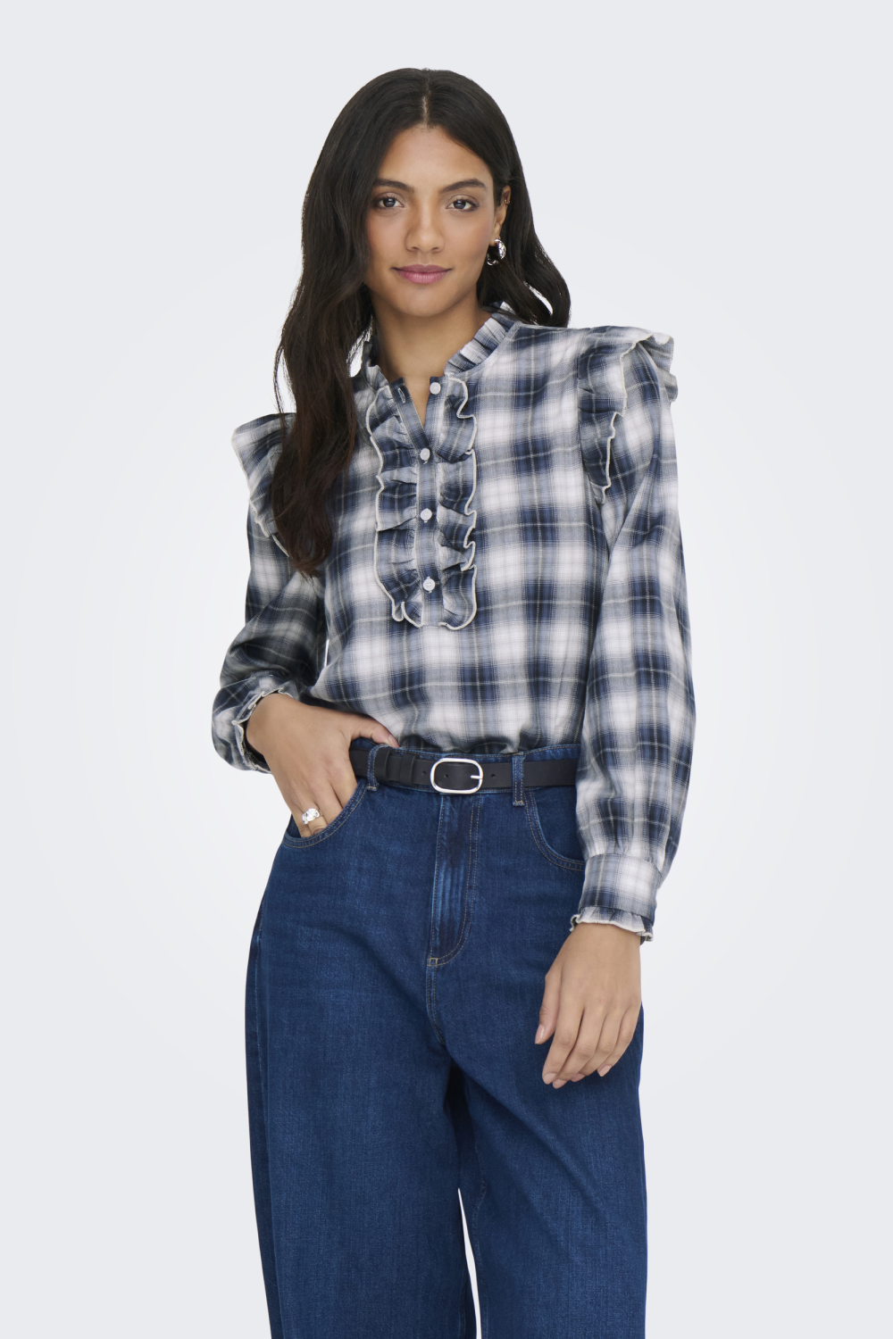 Deze casual geblokte blouse van Only is een stijlvolle toevoeging aan jouw garderobe. Met een klassieke ronde hals en een opvallend patroon in de kleurcombinatie Cloud Dancer/Night Sky, biedt deze blouse een unieke uitstraling. De lange mouwen en het gebruik van 100% katoen zorgen voor een comfortabel draaggevoel, ideaal voor dagelijks gebruik. De prachtige ruches langs de knoopsluiting geven het geheel een speelse touch, terwijl de regular fit zorgt voor een ontspannen pasvorm. Of je nu een dag op kantoor doorbrengt of een casual ontmoetingsplek kiest, deze blouse biedt veelzijdigheid en stijl. De normalere lengte maakt het eenvoudig om te combineren met een jeans of een nette broek, waardoor het geschikt is voor verschillende gelegenheden. Met zijn tijdloze design en comfortabele materialen is deze blouse een praktische keuze die zowel stijlvol als functioneel is.