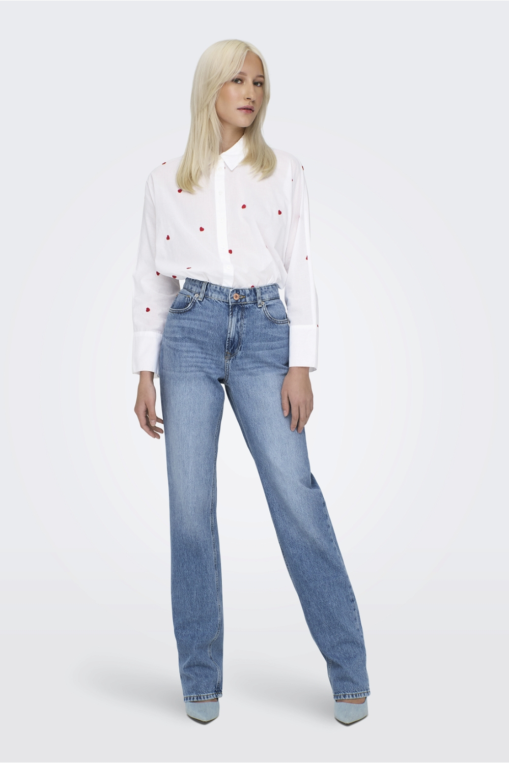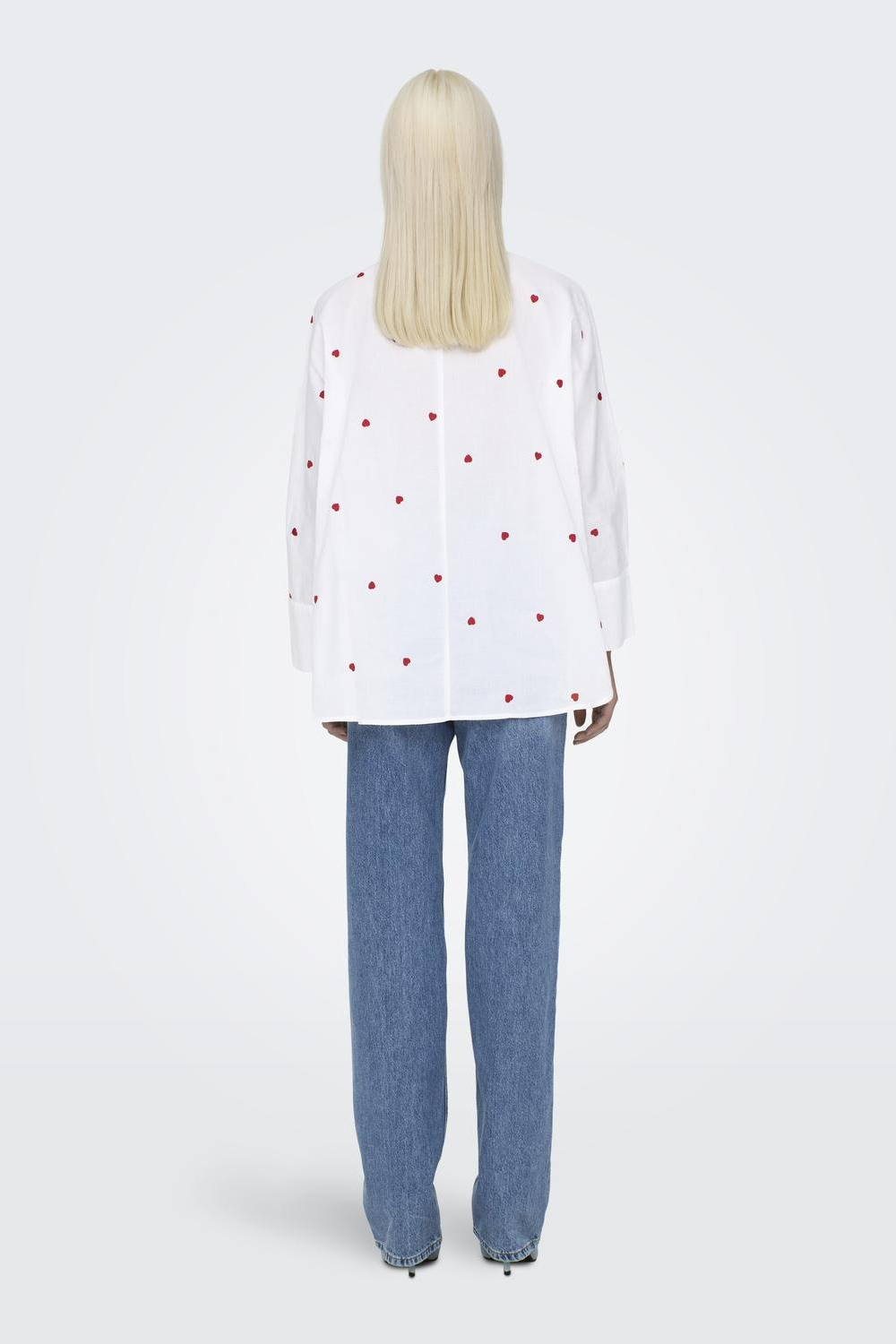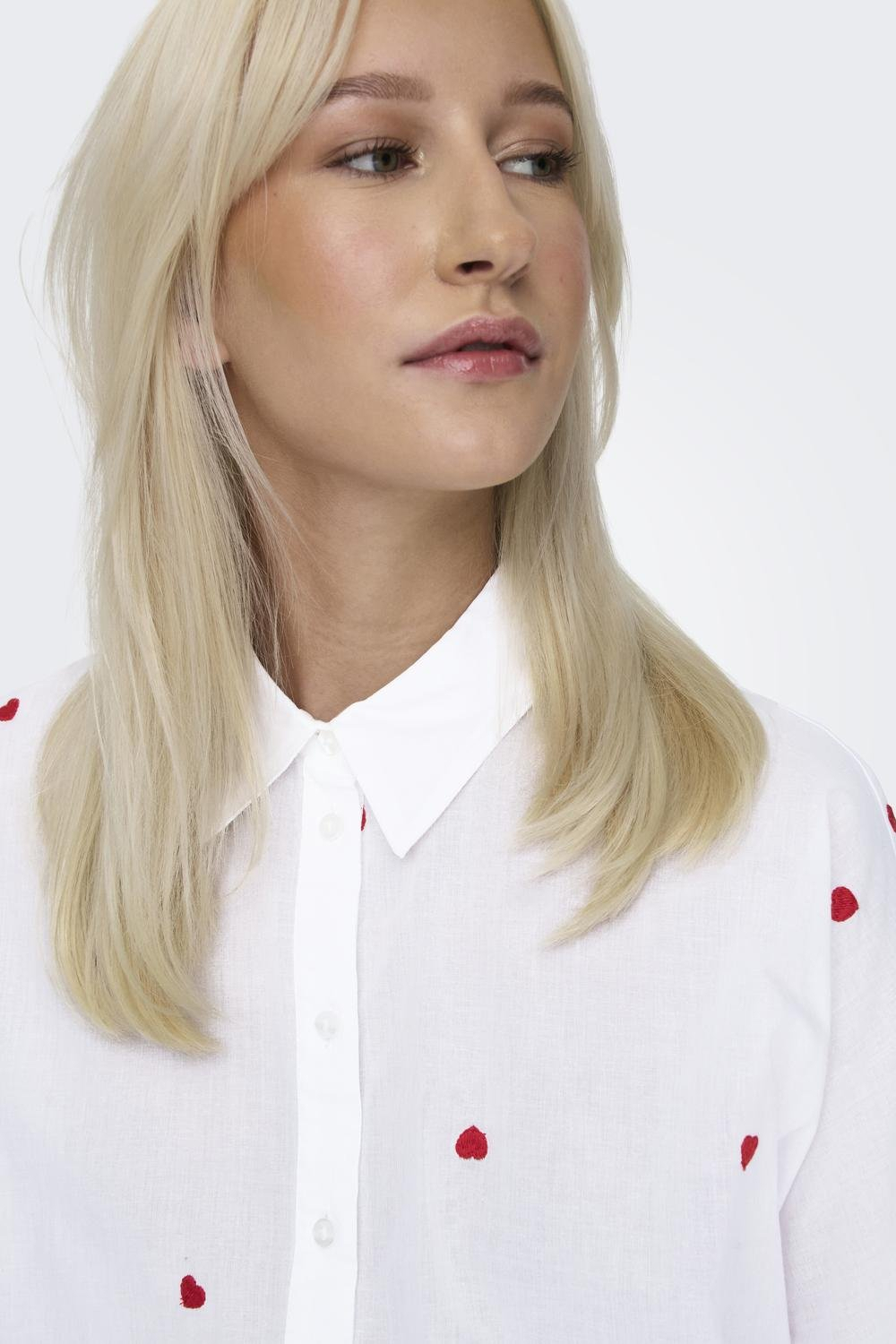 Ruime blouse van Only met geborduurde hartjes. Dit model heeft een puntkraag en sluit met een rij knopen. De lange mouwen hebben manchetten.