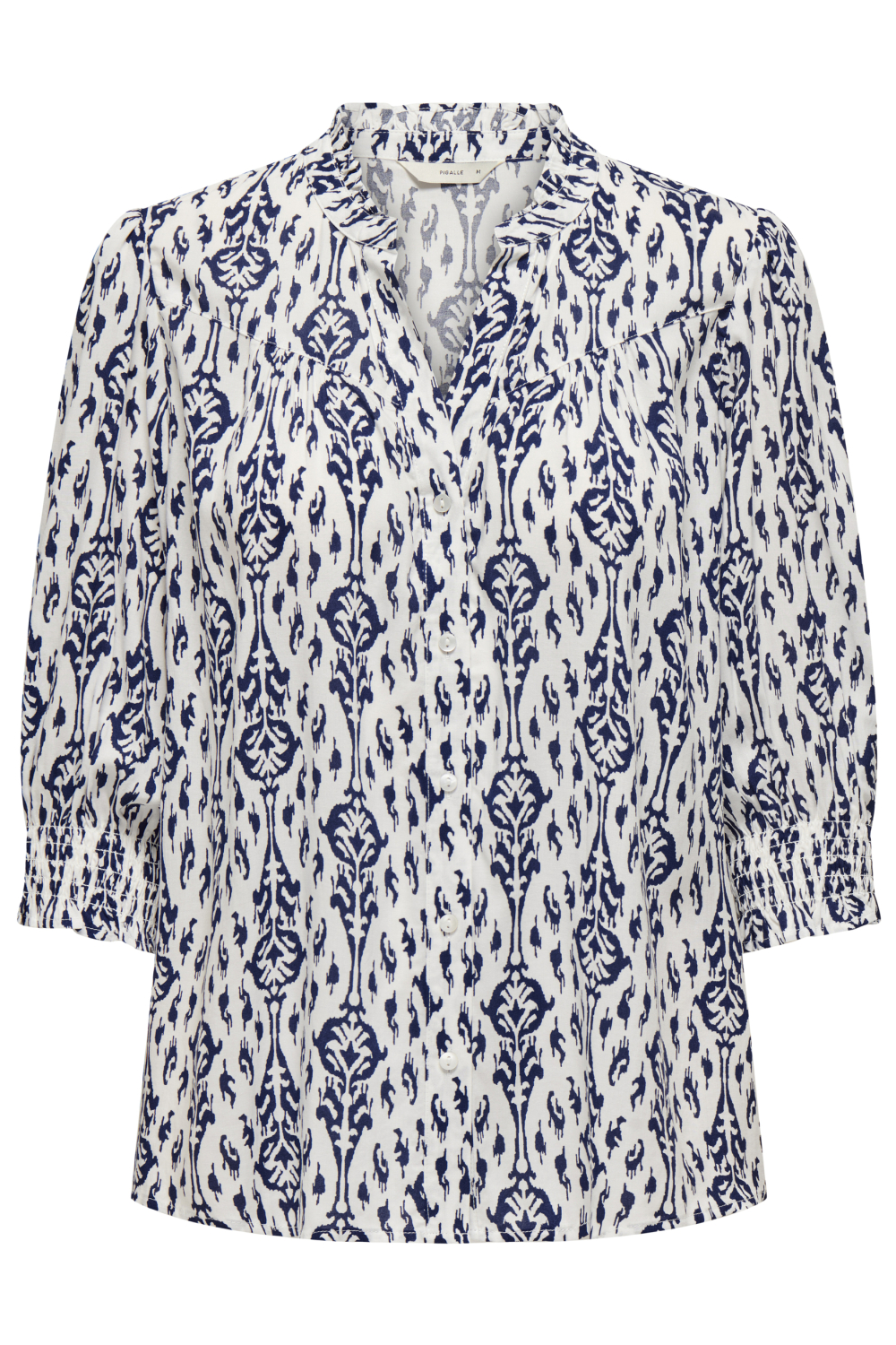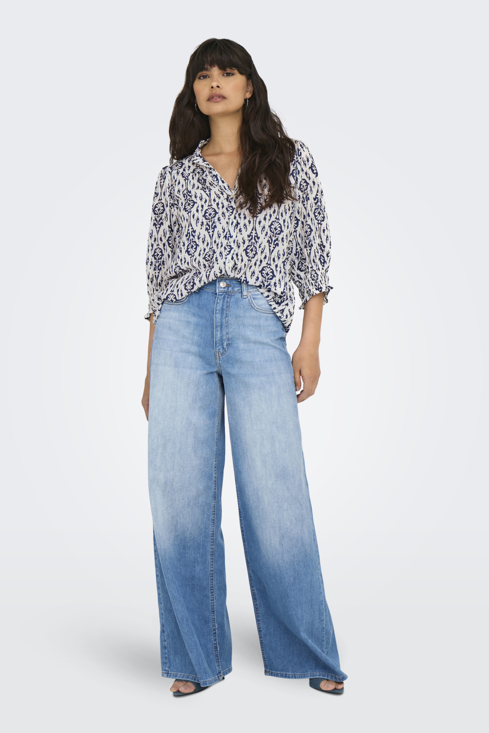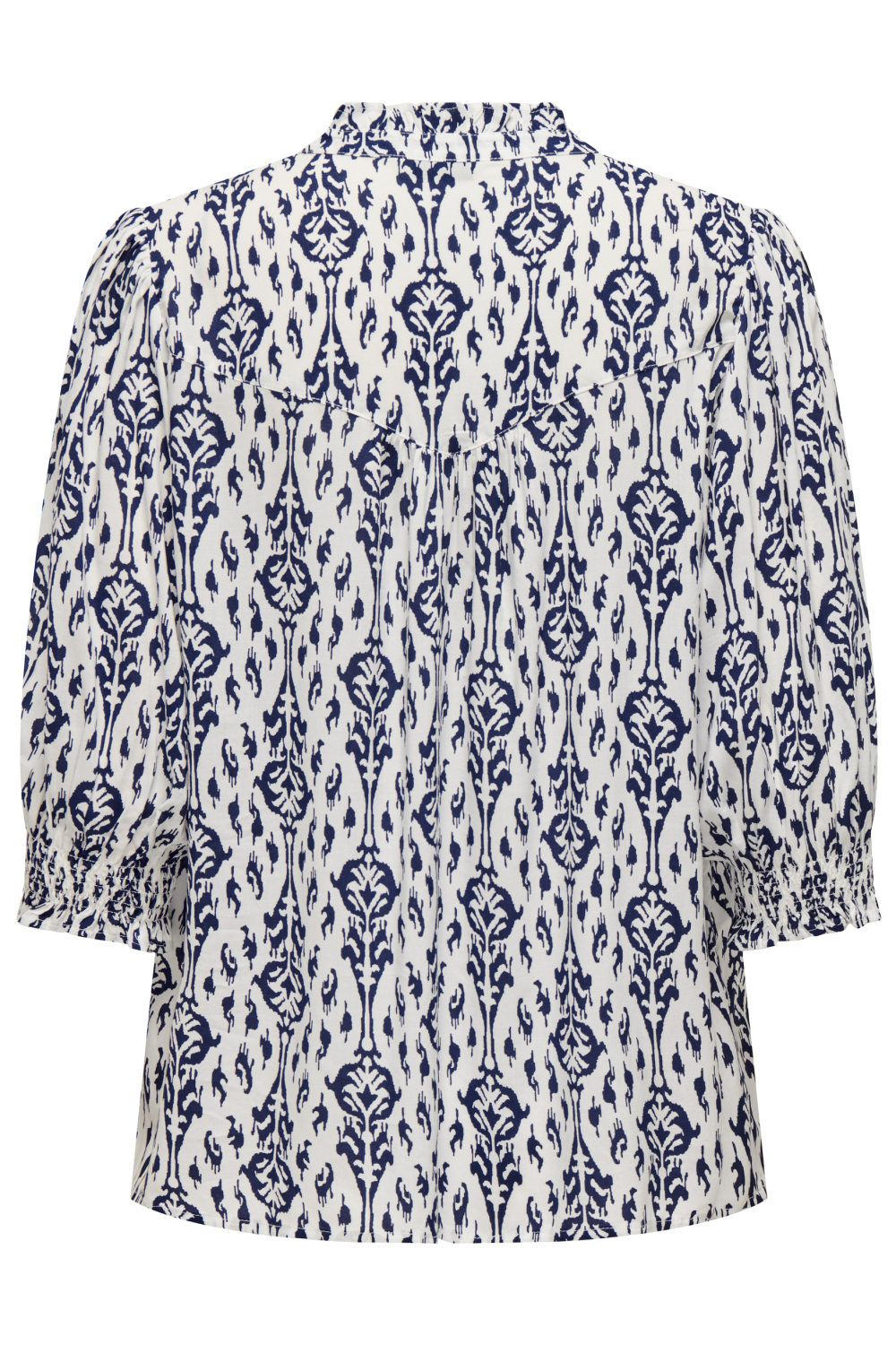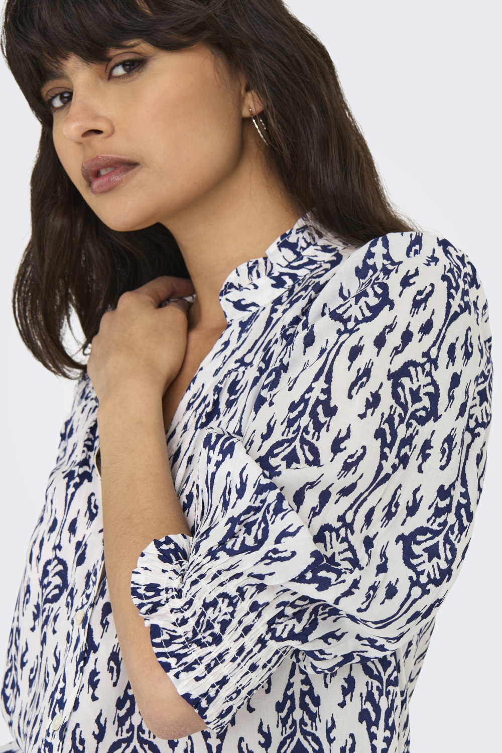 Deze stijlvolle blouse van Only straalt casual elegantie uit en is een verrijking voor je voorjaarsgarderobe. Gemaakt van 100% viscose, biedt deze blouse het lichte en ademende gevoel dat je zoekt tijdens warmere dagen. Het grafische patroon in diepblauw op een crèmekleurige achtergrond geeft het kledingstuk een speelse, maar toch verfijnde uitstraling. De blouse heeft een V-hals en drie kwart mouwen, wat zorgt voor een luchtige en flatterende pasvorm waarin je je comfortabel kunt bewegen.