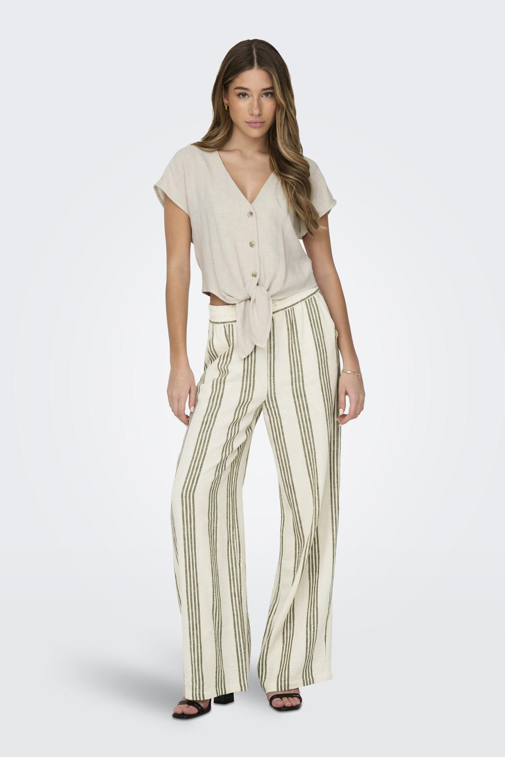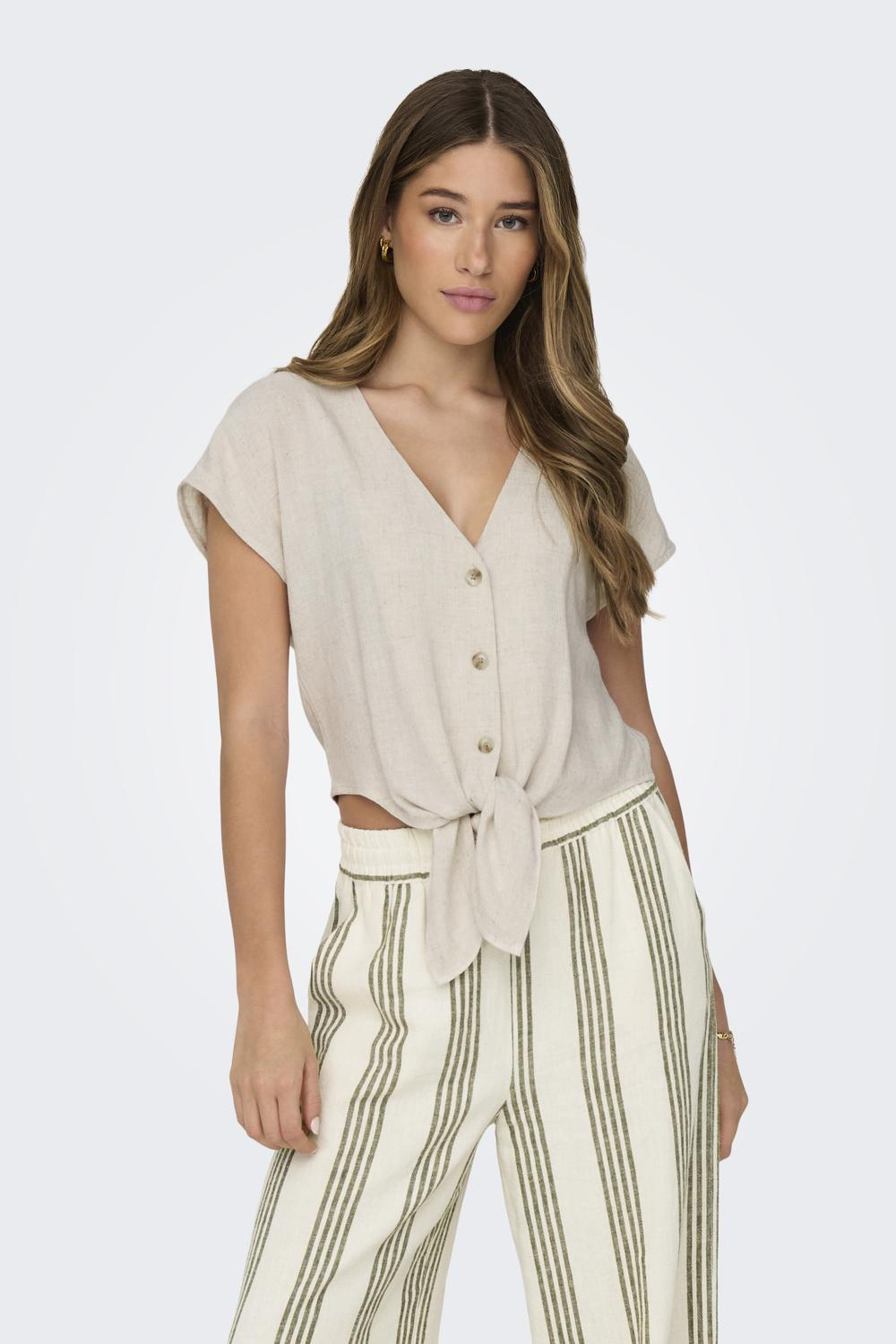 Deze verfijnde blouse van Only, in de warme tint Moonbeam, is een veelzijdige keuze voor jouw garderobe. Met een comfortabele mix van 80% viscose en 20% linnen biedt de blouse een ademende en lichte ervaring, ideaal voor elk seizoen. Het gemêleerde patroon voegt subtiele diepte toe aan het ontwerp. De blouse heeft een regular fit en korte mouwen, wat zorgt voor een ontspannen uitstraling. Dankzij de charmante V-hals en de knoopsluiting aan de voorkant straalt deze blouse eenvoudige elegantie uit. De Only blouse is perfect voor casual gelegenheden en laat zich gemakkelijk combineren met verschillende stijlen. Of je nu kiest voor een jeans of een luchtige zomerbroek, deze blouse past zich moeiteloos aan jouw outfit aan. De knoopdetail aan de voorkant geeft een speelse twist, terwijl de korte lengte bijdraagt aan een frisse look. Dit is een ideale keuze voor een informele lunch, een dagje uit of een ontspannen middag in het park. Combineer naar hartelust en creëer een outfit die bij elke situatie past, terwijl je geniet van het comfort en de stijl die deze blouse te bieden heeft.
