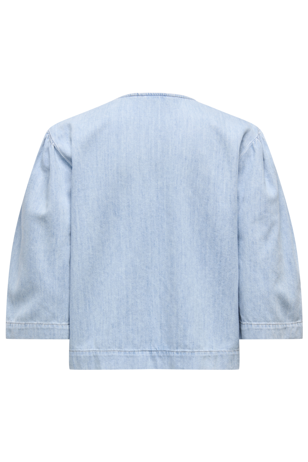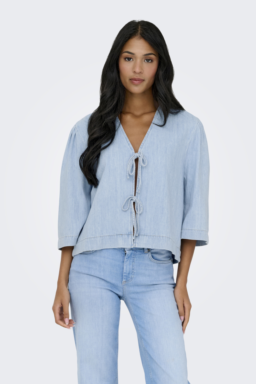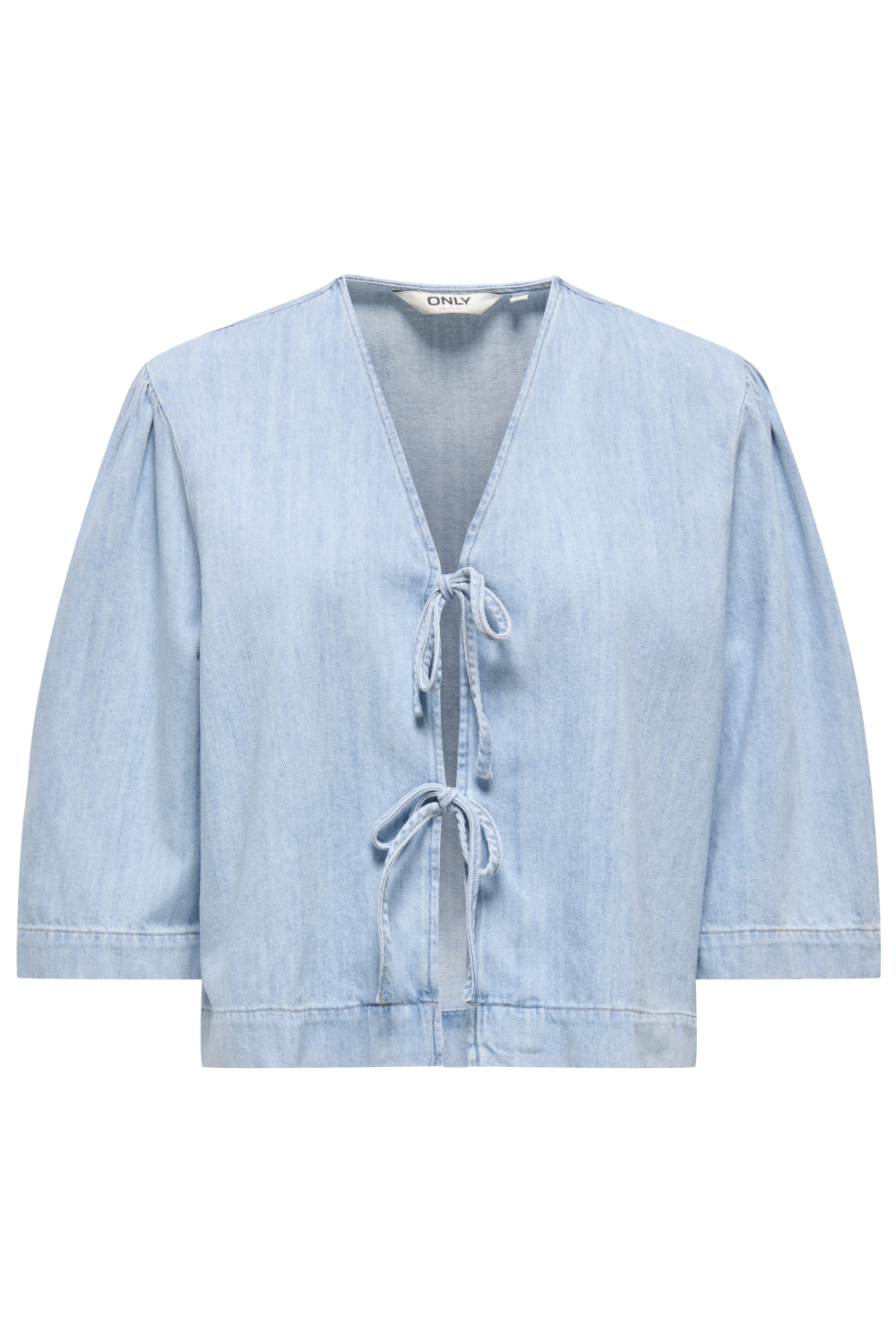 Deze lichtblauwe denim blouse van Only is een stijlvolle toevoeging aan je casual garderobe. De blouse is vervaardigd uit 100% katoen, wat zorgt voor een comfortabele en ademende stof, perfect voor de lente. De regular fit geeft een ontspannen uitstraling, terwijl de subtiele V-hals en het strikkoord een speelse toets toevoegen aan het geheel. De 3/4 mouwen maken het een frisse keuze voor verschillende gelegenheden, of je nu een dagje uit gaat of een informele werklunch hebt.